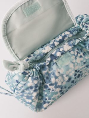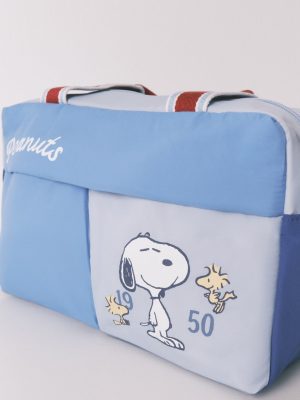 حقيبة مستحضرات تجميل مصنوعة من القماش الشبكي والنايلون، مطبوعة بدرجات الأصفر والأزرق، ومزينة برخصة سنوبي. مثالية لحمل جميع إكسسواراتك بطريقة منظمة وممتعة. مثالية لحمل جميع مستلزماتك التجميلية دائمًا. - المقاسات: ١٧