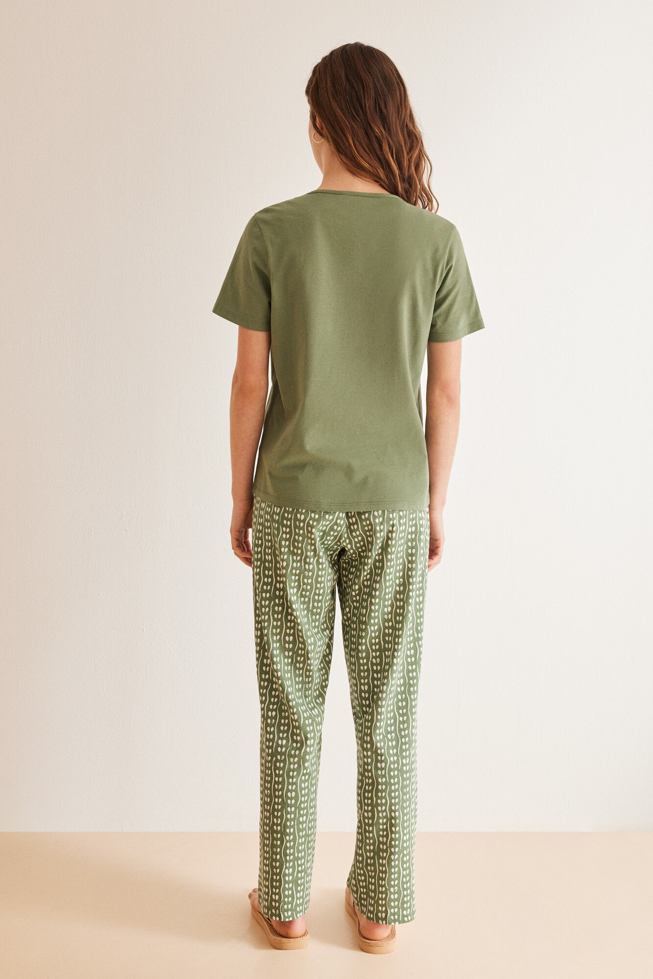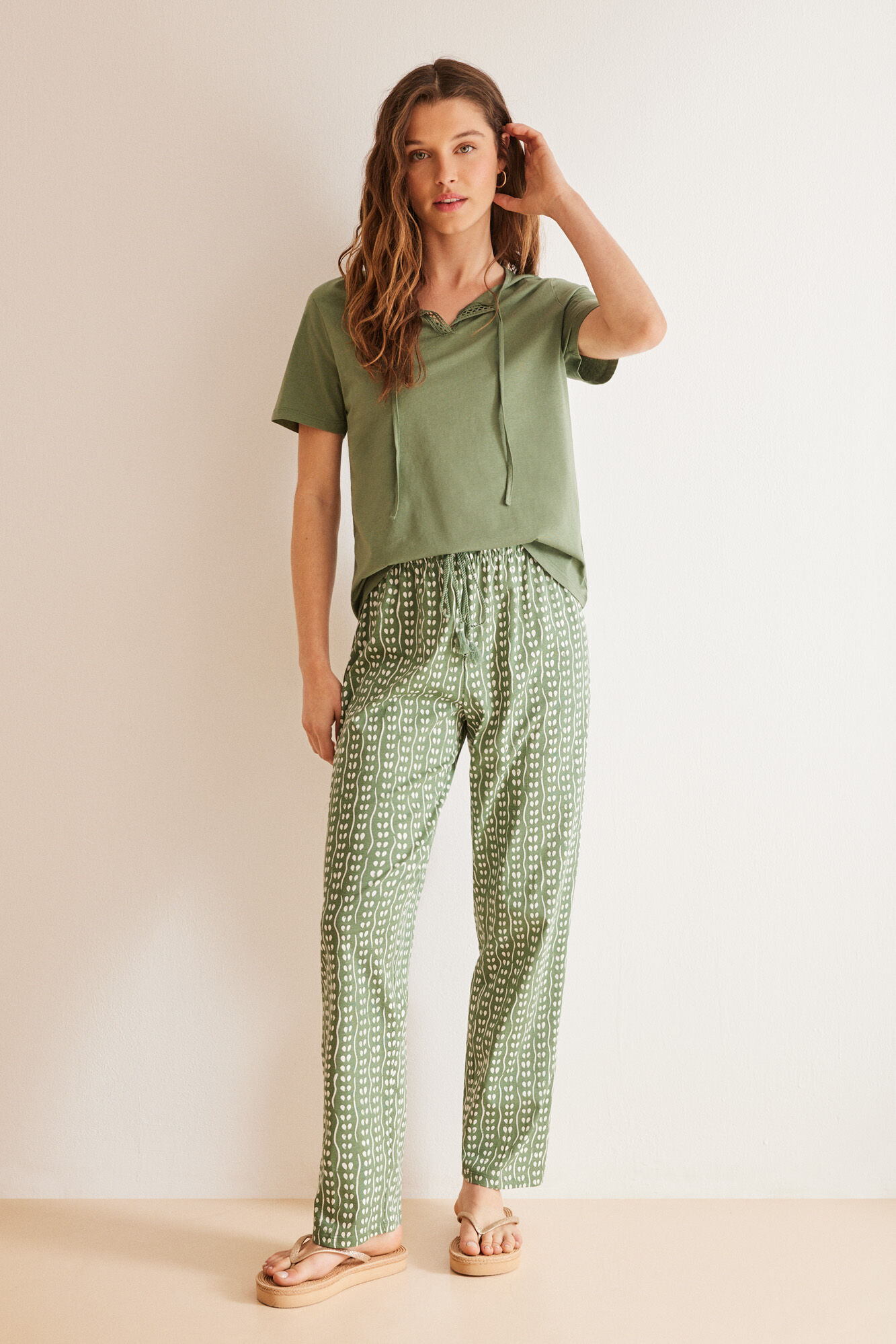100% Cotton pyjamas with short-sleeved top and long bottoms, made in green cotton. It”s so practical and convenient, that you won”t want to take it off all day. Perfect for this summer! Plain V-neck top with lace opening and tie ribbon. Trousers in a geom