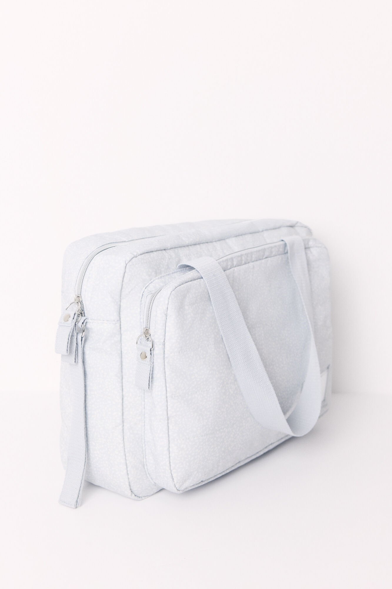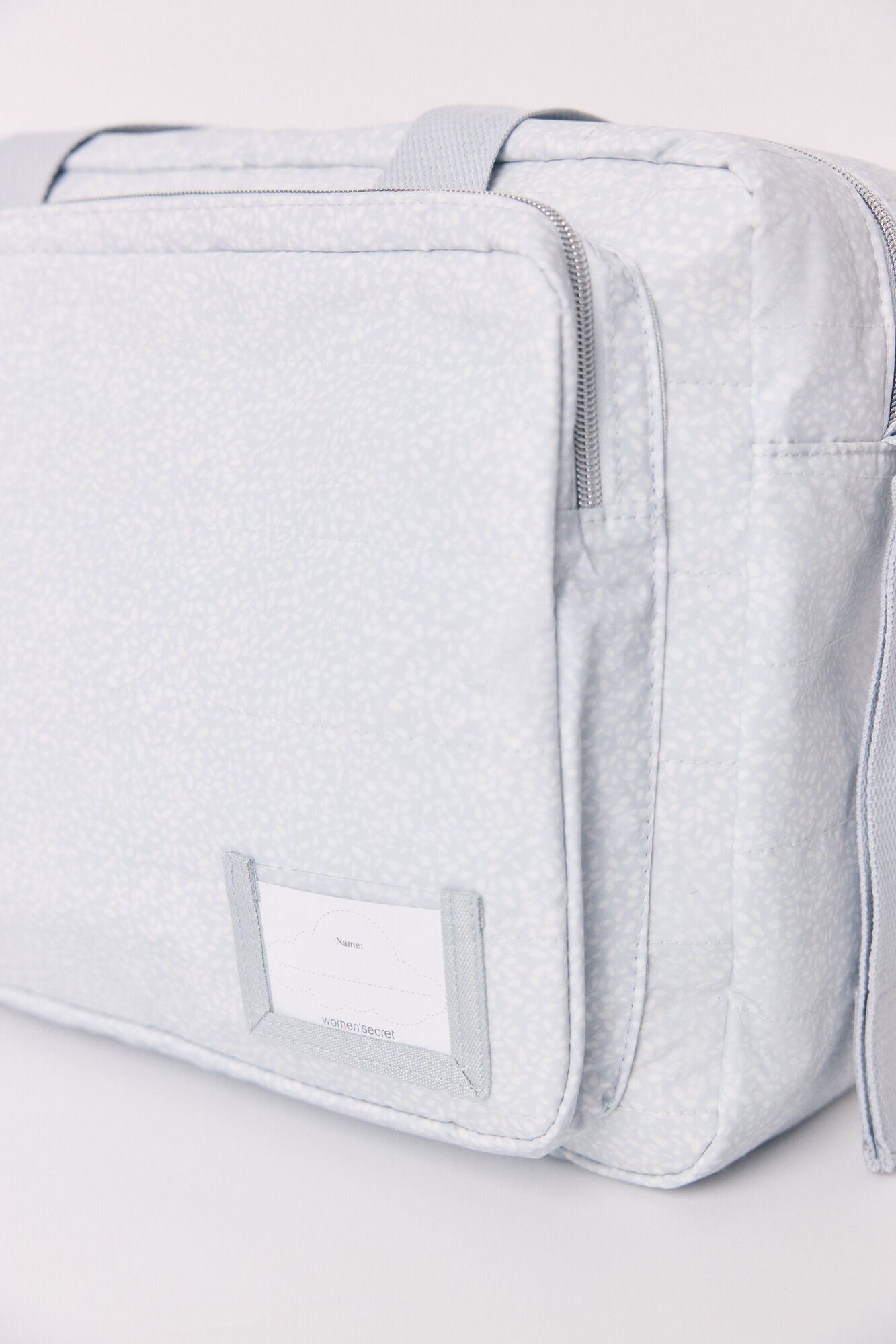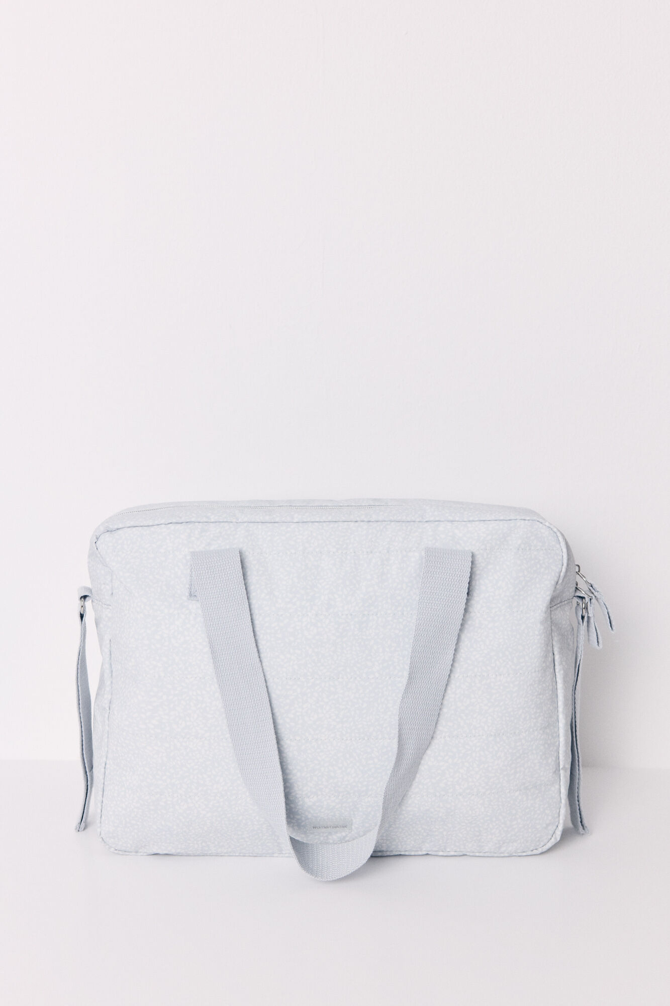 maternity bag with a central compartment and practical front pocket . In laminated quilted finish with gray allover dot print . With central label to personalize it. With practical zippers and handle (short) strap (long) for easier transport. Measurements