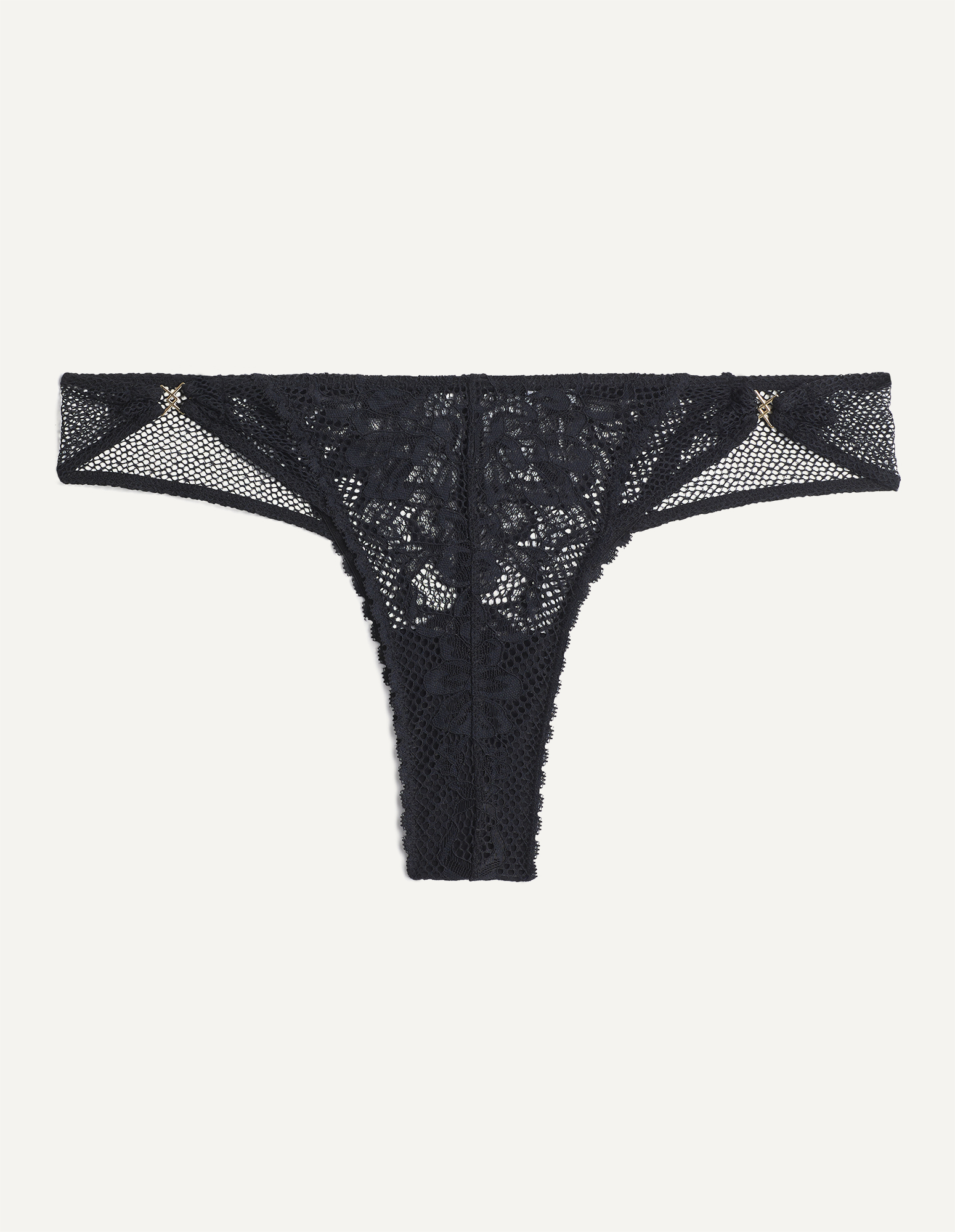 Made of recycled black lace with a net effect, the Afrodite line catches the eye with its provocative and sophisticated design. The play of elastic bands and bold openings give a unique and irresistible look. Each piece is embellished with a small gold de