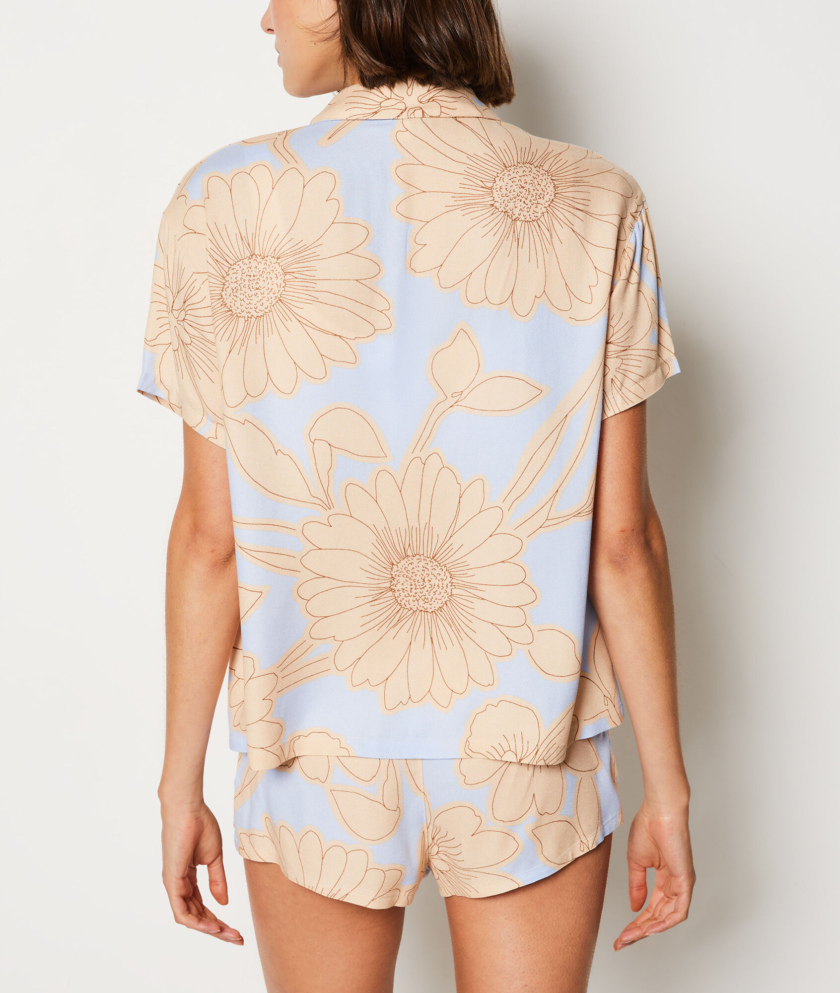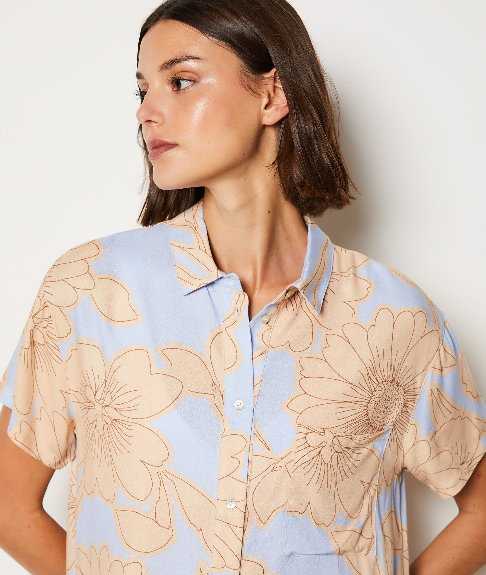This short-sleeved shirt adorned with delicate flowers and pastel colors stands out with its button closure, V-neck, and ultra-light material.
