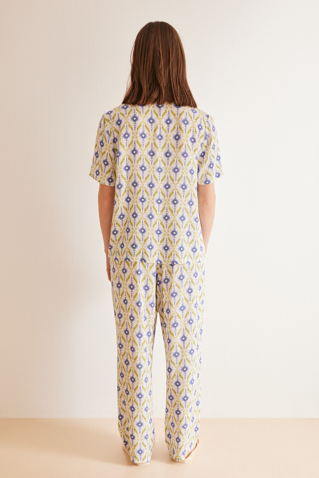 Classic pyjamas in viscose, with short-sleeved shirt and long bottoms, in white with a contrasting geometric ikat print. It”s so practical and convenient, that you won”t want to take it off all day. Perfect for this summer! Top with shirt collar, central