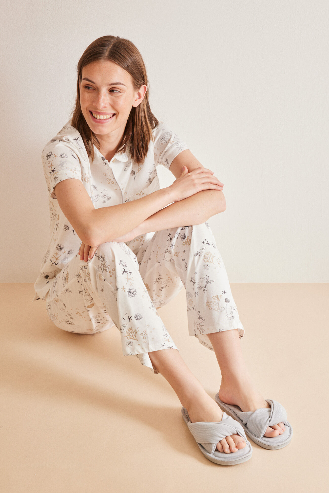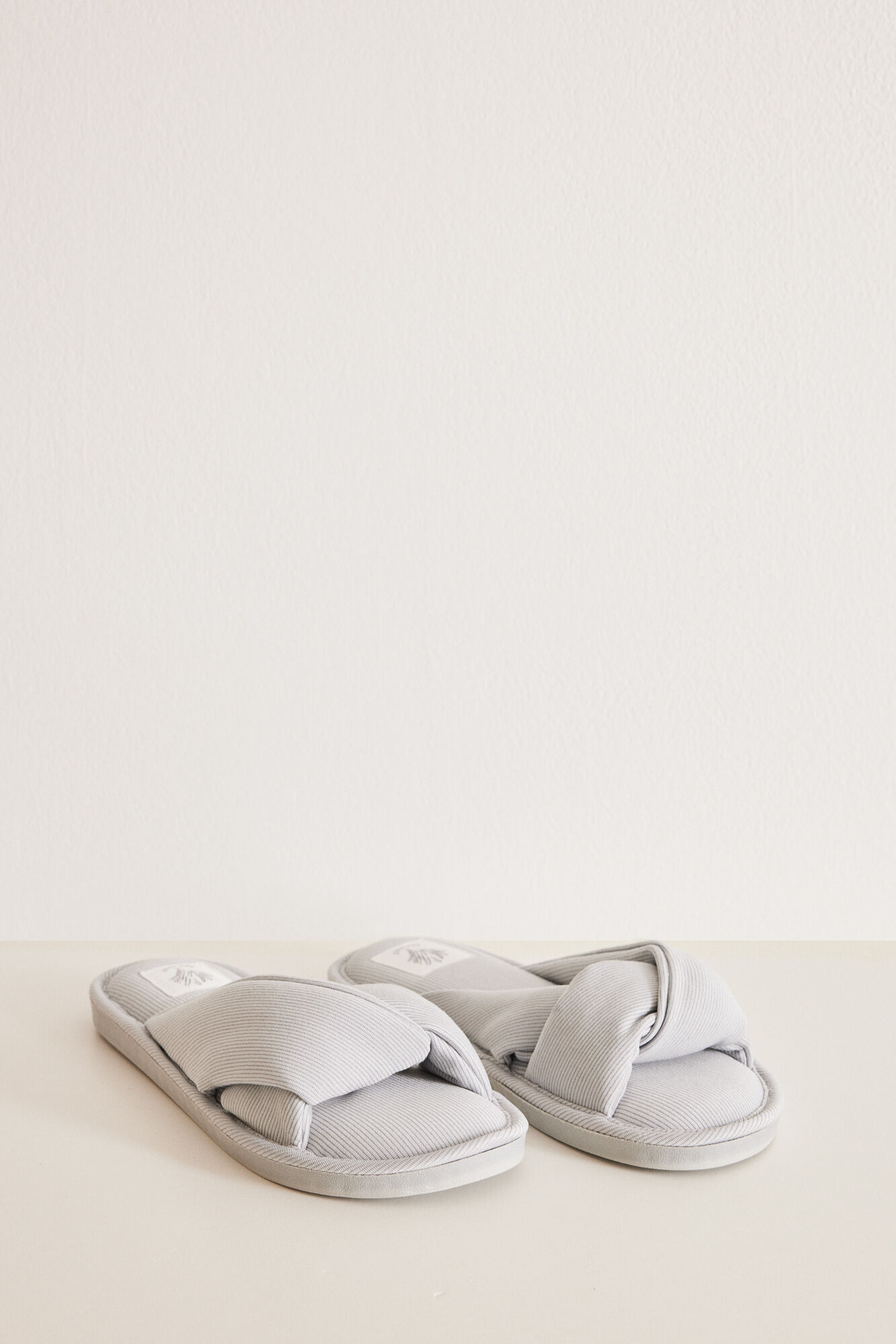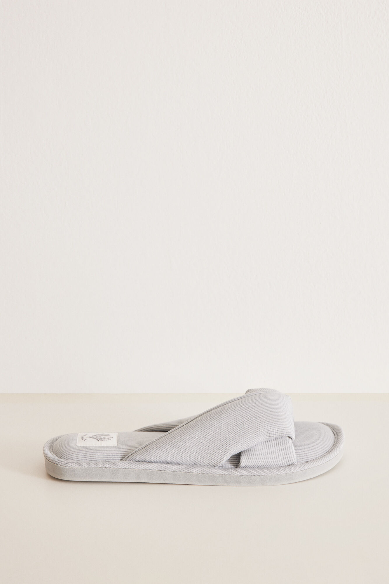 Slippers in a pretty grey colour with ribbed texture and a looped strap. Perfect for that moment when you get home and finally swap your shoes for your slippers. Wear them with the matching pyjamas and vanity case.