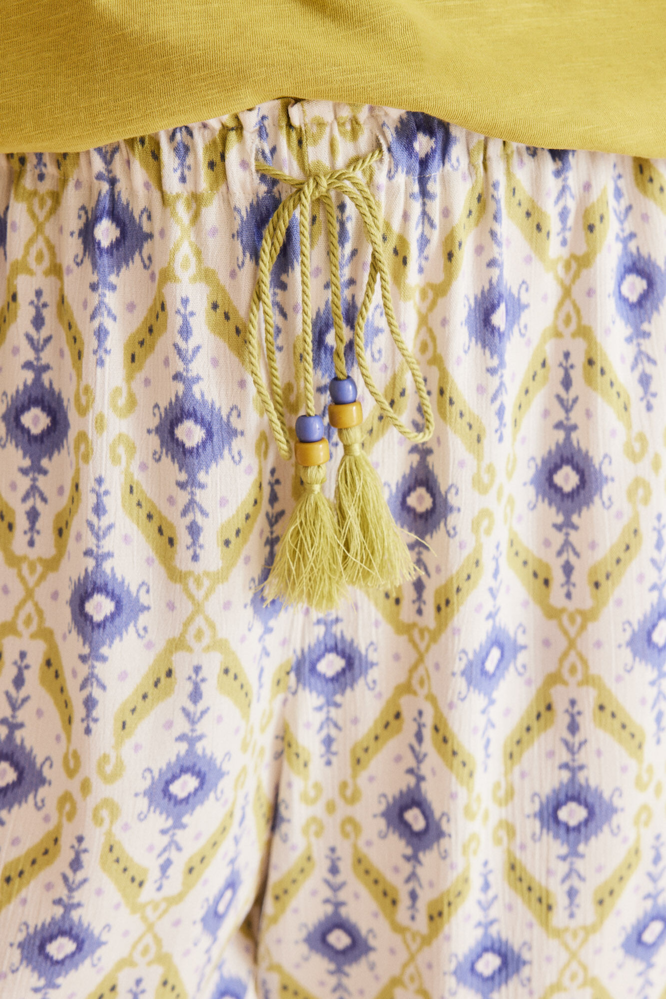 Capri trousers in a chiffon fabric with a geometric print, in gorgeous green and blue tones. It”s so practical and convenient, that you won”t want to take it off all day. Perfect for this summer! Adjustable elasticated drawstring waist with bead and tasse