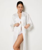 Opt for an elegant night-time ensemble with this robe crafted from soft, satiny material. Its delicate lace details gracefully adorn the ends of the long sleeves.