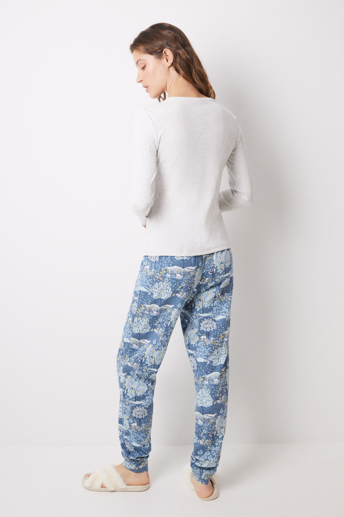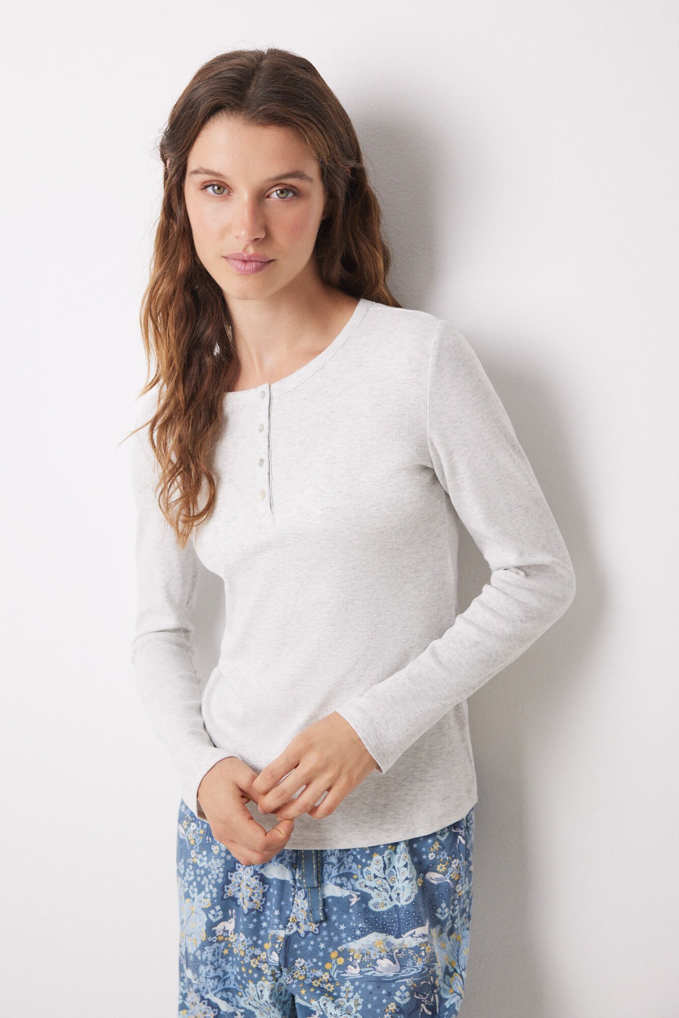 Pajamas with long sleeve T-shirt and long skinny trouser , made of cotton fabric . It is super comfortable and pleasant to the touch. Wear it to match other clothes and accessories from the collection, and keep your style at home too. Gray ribbed T-shirt