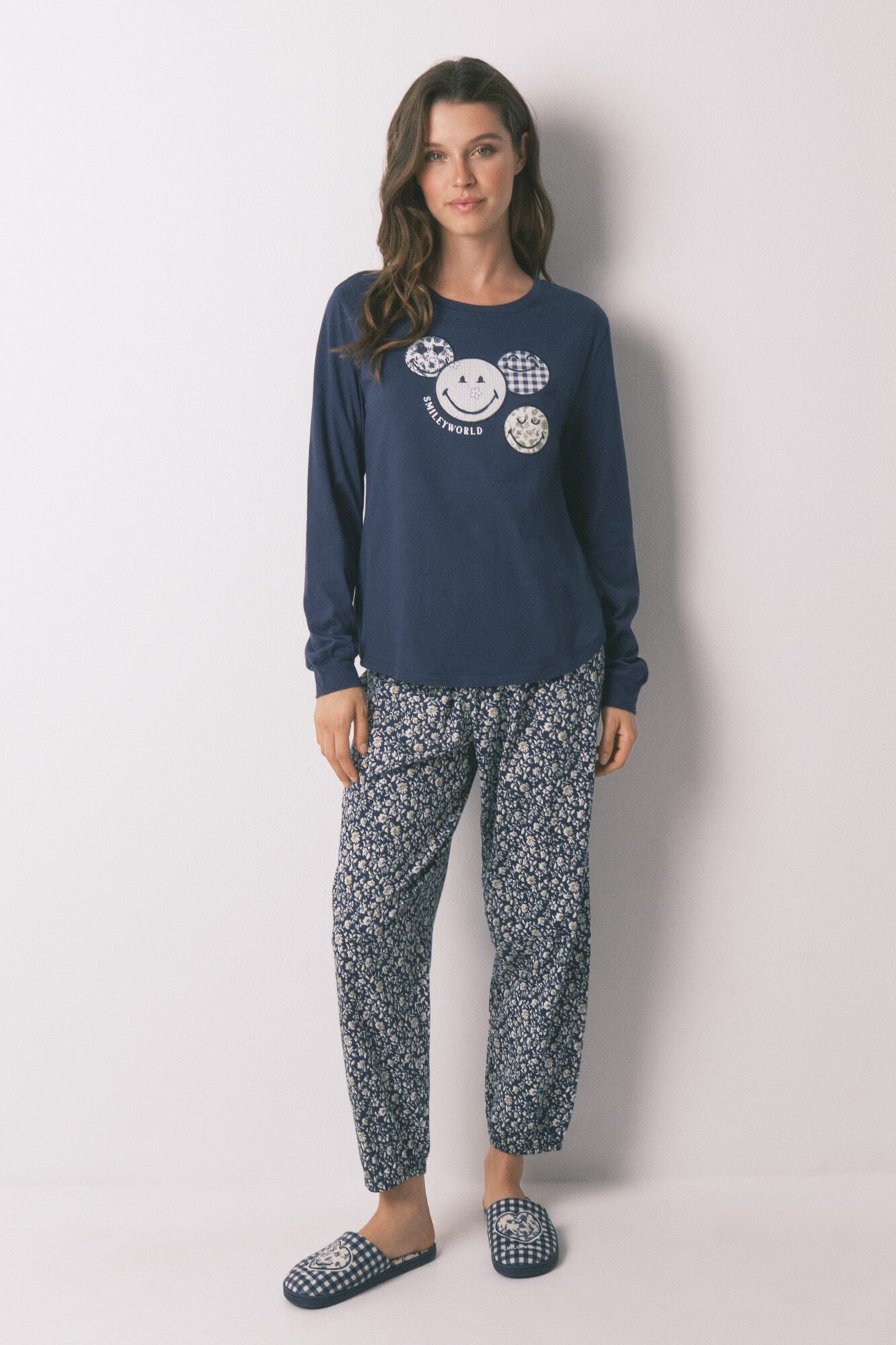-30%بيجاما طويلة مصنوعة من القطن 100%. توب سادة برقبة دائرية وأكتاف منسدلة وأساور أكمام وحافة دائرية وطبعة SmileyWorld® في المنتصف الأمامي. يتميز البنطلون بطبعة زهور شاملة وحزام خصر مطاطي وفتحة وهمية مع