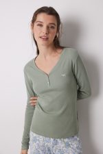 -70%Long pajamas, made with 100% cotton fabric , with a green elastic ribbed T-shirt and contrasting floral print trouser. Ideal for staying at home super comfortable and stylish.