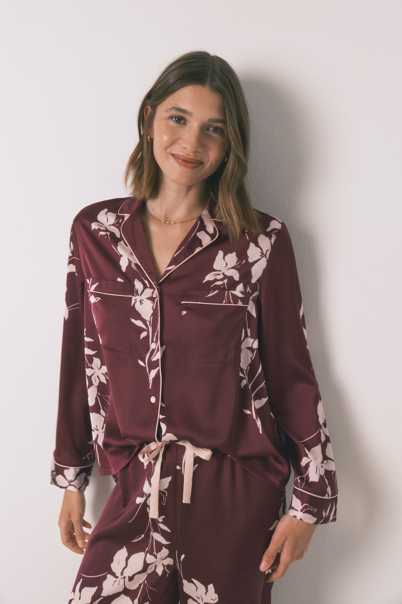 -30%طقم بيجاما طويل بطبعة زهور. توب بياقات وأزرار متباينة، وجيوب أمامية، وشريط زخرفي. بنطلون بخصر قابل للتعديل ورباط سحب متباين. خفيف الوزن، مثالي للأجواء الدافئة. مثالي لليلة مريحة