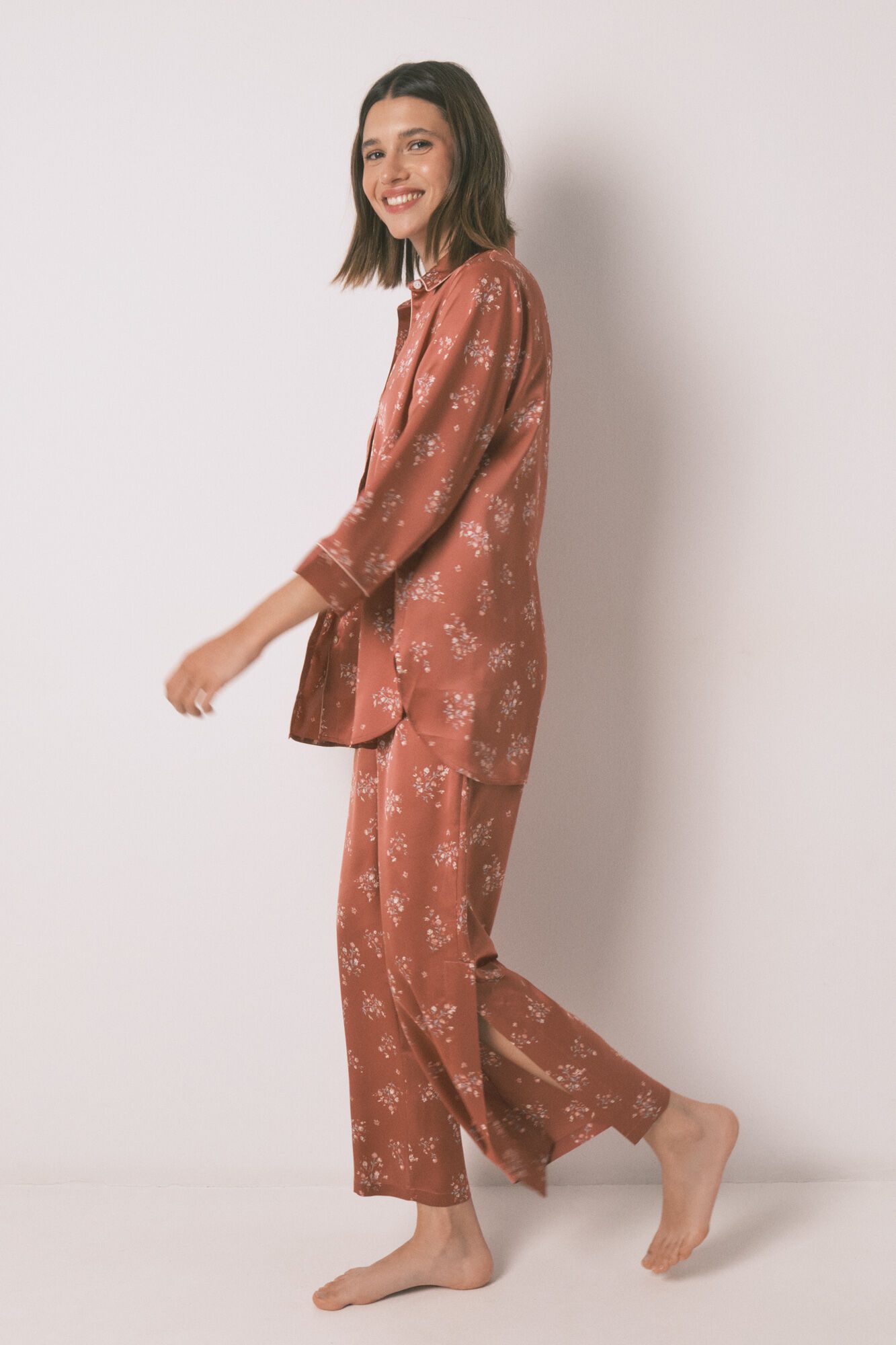 -30%قميص بيجاما بأكمام 3/4 وبنطلون طويل مع طبعة زهور شاملة على قماش الساتان المطفأ. مثالي للنوم أو الاسترخاء في المنزل براحة وأناقة.