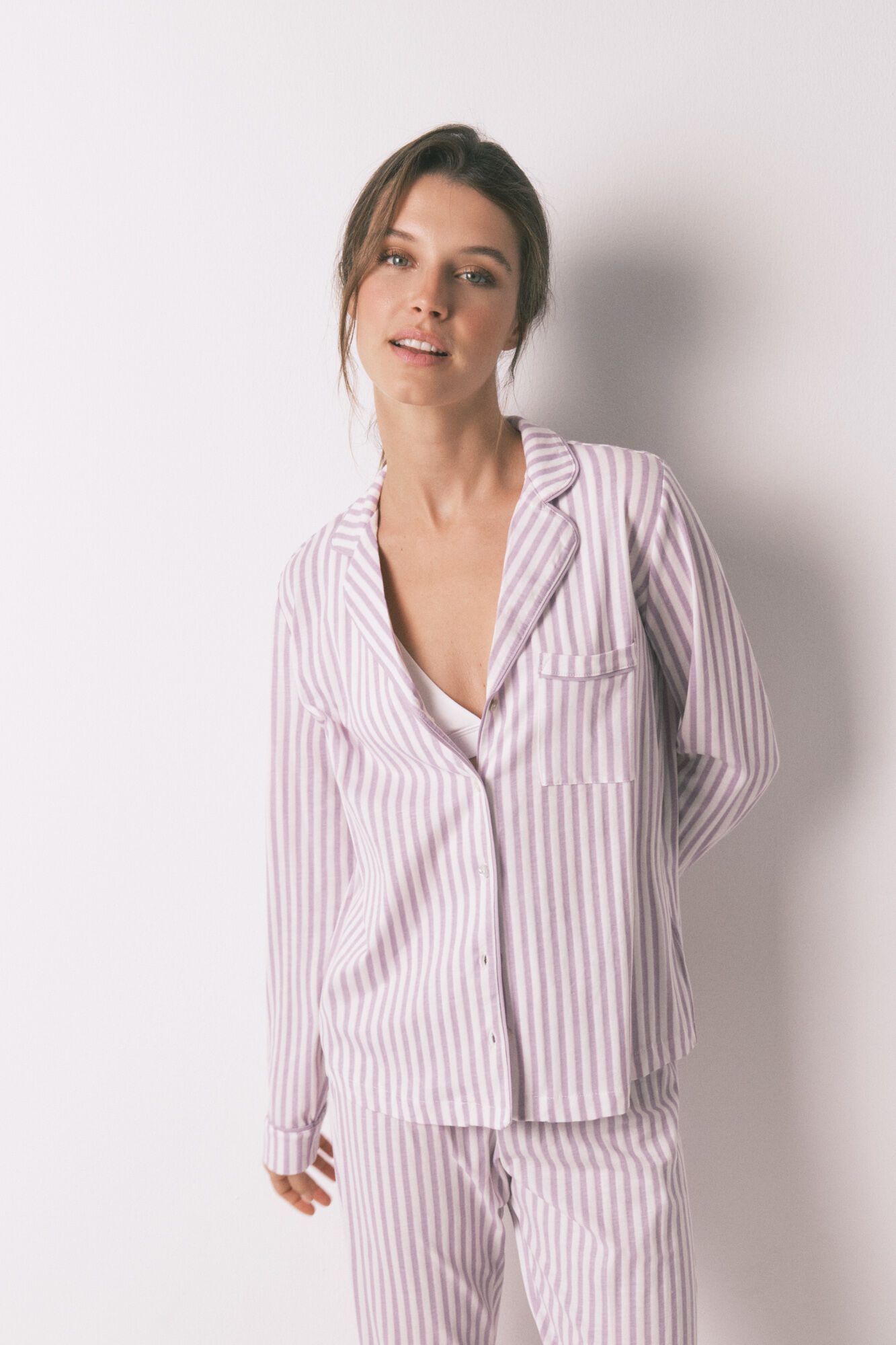 بيجاما كلاسيكية بأكمام طويلة وبنطلون بطبعة مخططة زرقاء بالكامل، مصنوعة من قماش قطني 100%. بلوزة بياقة قميص وأزرار متباينة، وجيب على الصدر أو الصدر بتفاصيل حواف متباينة تتناسب مع الأكمام. بنطلون مع