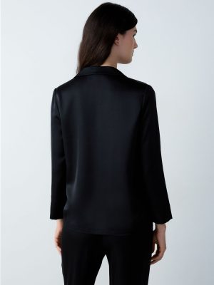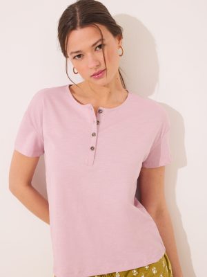 – With a round neck, a baker’s style and a front placket detail with mother-of-pearl buttons .