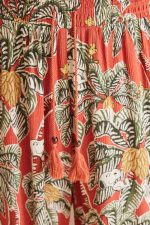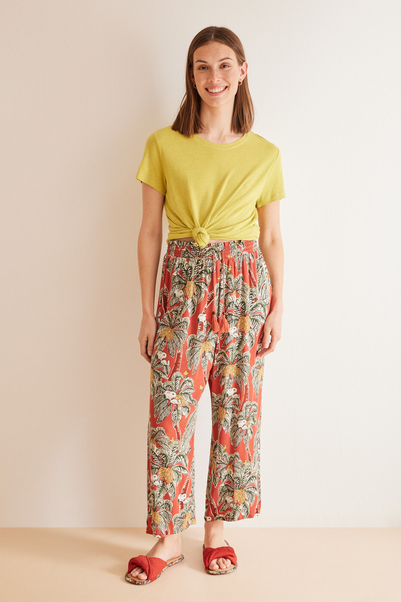 Long floaty trousers in viscose fabric with a tropical Snoopy print. Perfect for bedtime, lounging at home, or relaxed street styles. Elasticated waistband with smock knit, adjustable with matching tassel cord. Match them with different tops from the same