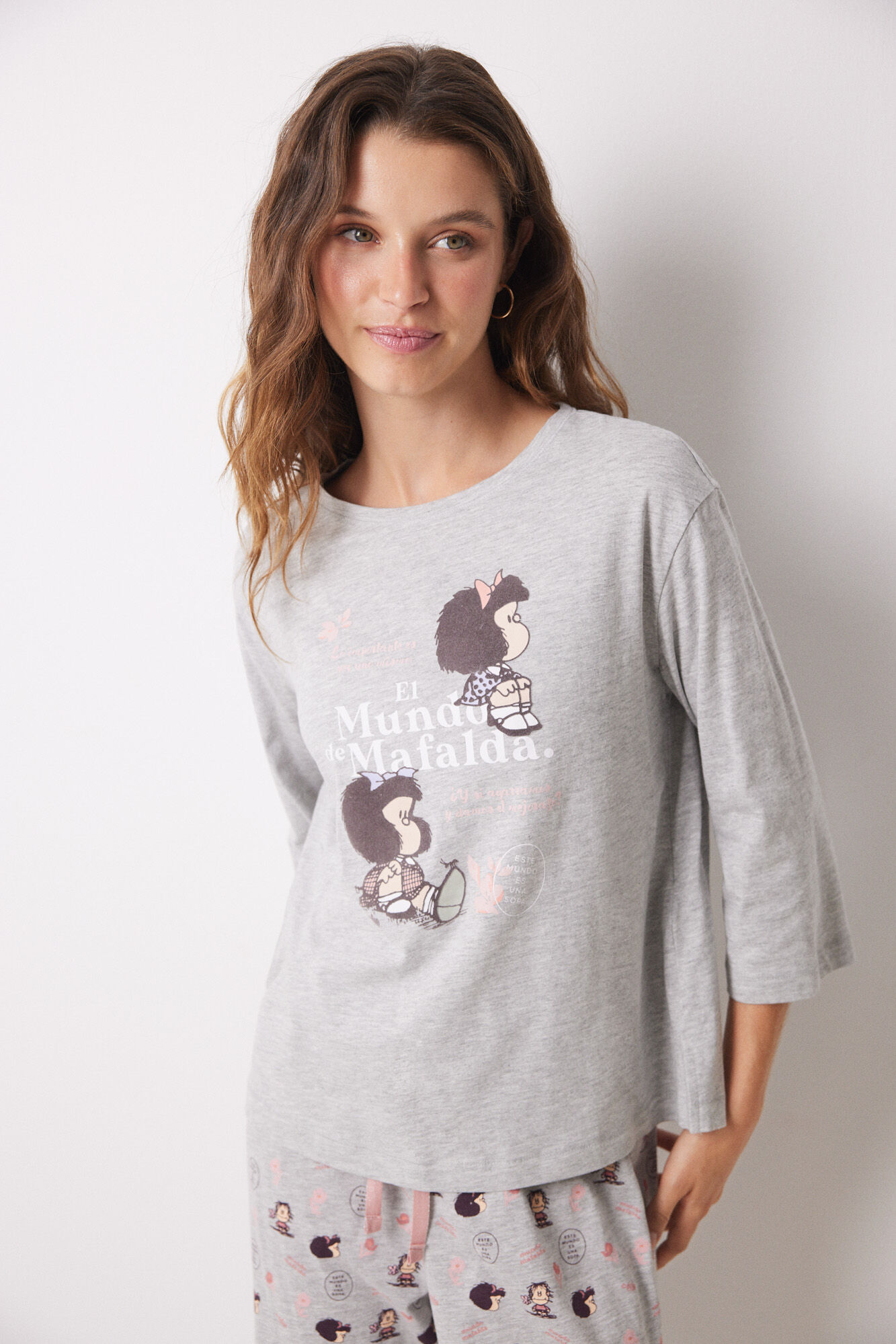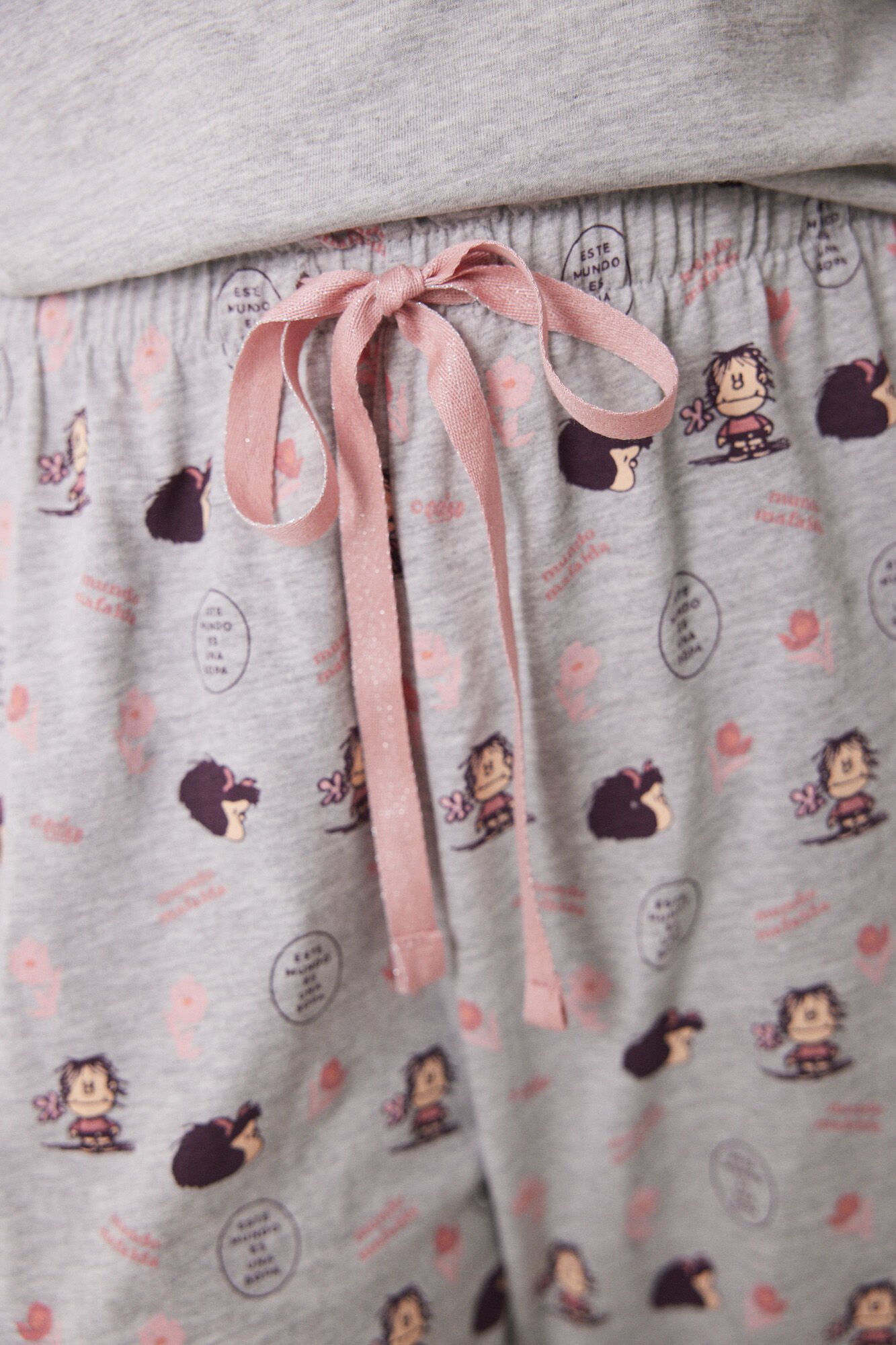 Long pajamas, consisting of a long sleeve T-shirt and lounge trouser , made of 100% cotton fabric , in gray. Super soft and comfortable, you won”t want to take it off all day. Perfect for this season! T-shirt with front positioned Mafalda print , round ne