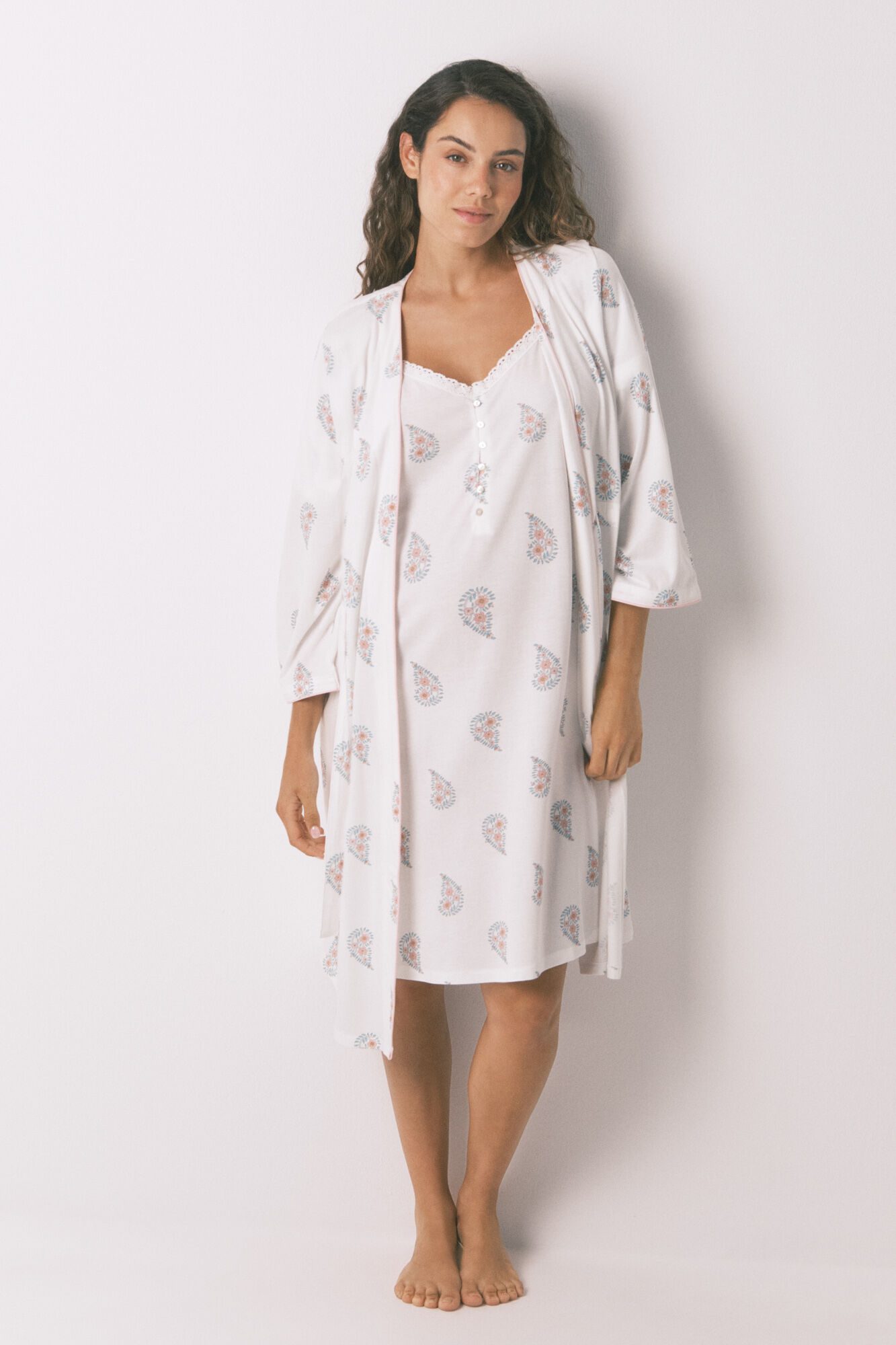 -30%روب حمل مصنوع من القطن والمودال. طول متوسط وأكمام طويلة مع أساور متطابقة. مثالي للارتداء مع قميص نوم: إنه الطقم المثالي. طبعة زهور شاملة. شريط زخرفي مطابق على خط العنق. حزام قابل للتعديل