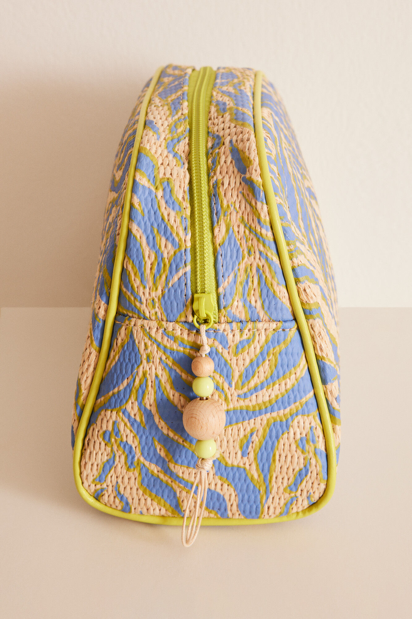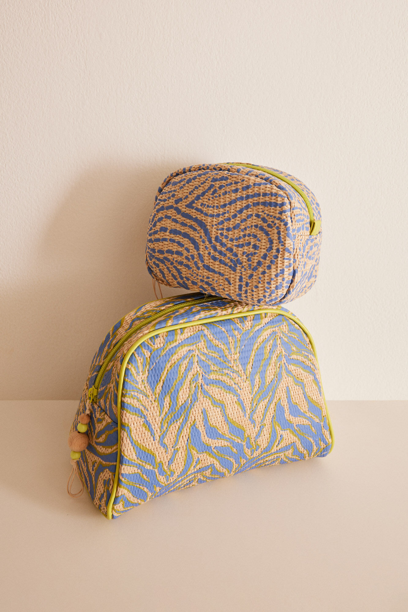 Medium raffia vanity case in blue and yellow zebra print. Ideal for carrying your beauty essentials that are super protected and organised.