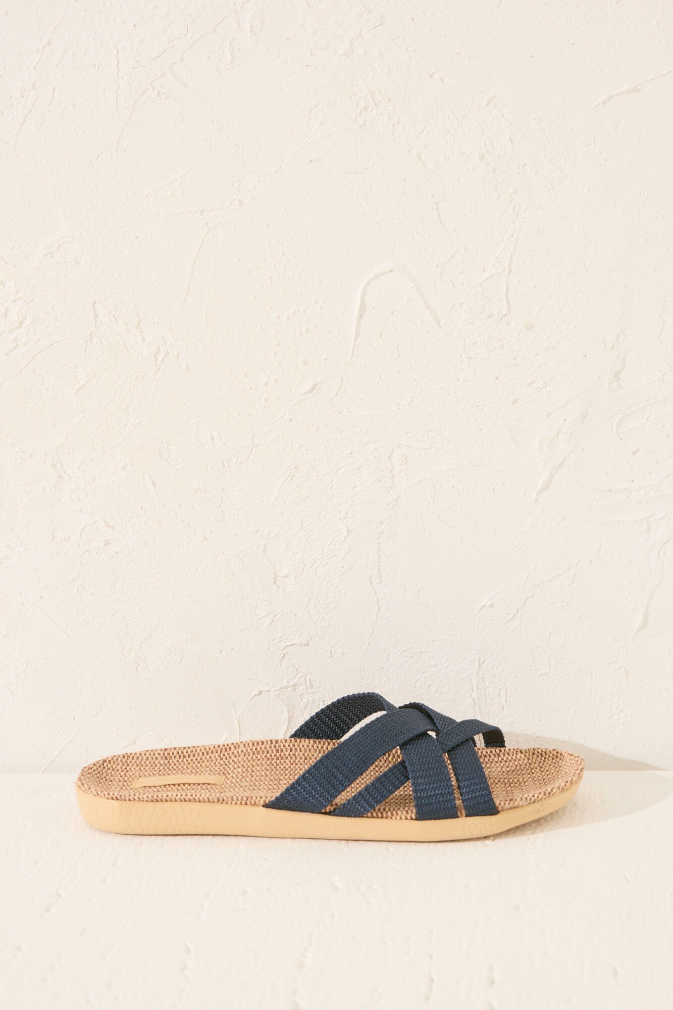 صندل بأحزمة باللونين الكحلي والخردلي، مصنوع من القماش بنعل طبيعي بتأثير الرافيا. مثالي للتنسيق مع أي قطعة من المجموعة. مريح للغاية وعصري: الإضافة المثالية لإطلالتك.