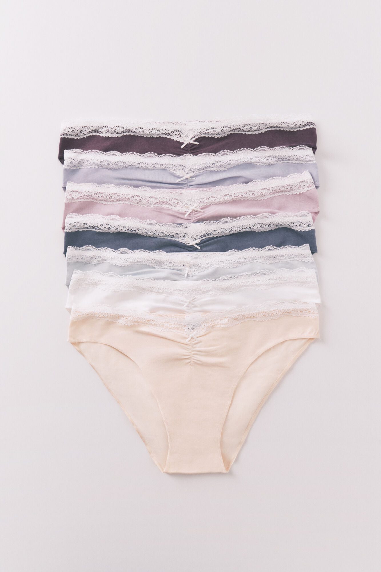 مجموعة من 7 سراويل داخلية قطنية كلاسيكية، بألوان سادة، مزينة بتفاصيل دانتيل، وربطة عنق أو فيونكة، وكشكشة. مصممة لتوفر لك الراحة والأناقة أثناء أنشطتك اليومية. تفاصيل من الدانتيل، وربطة عنق أو فيونكة، وكشكشة لإضفاء لمسة راقية. ناعمة ومريحة.