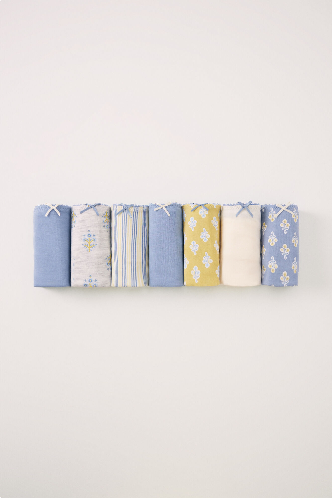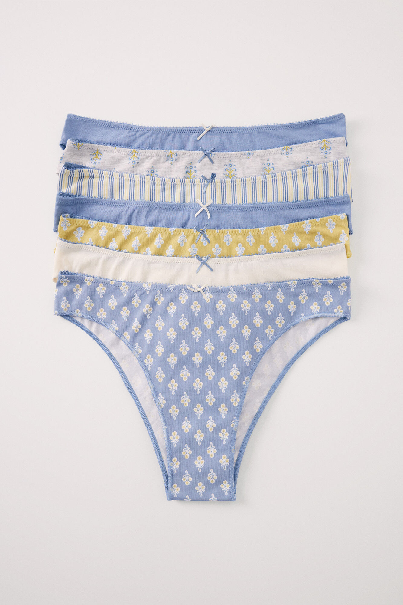 -70%Pack of seven plain cotton Brazilian panties with different prints in green and yellow tones. In addition, they have a small bow on the front as an original touch. Just ideal, right? .