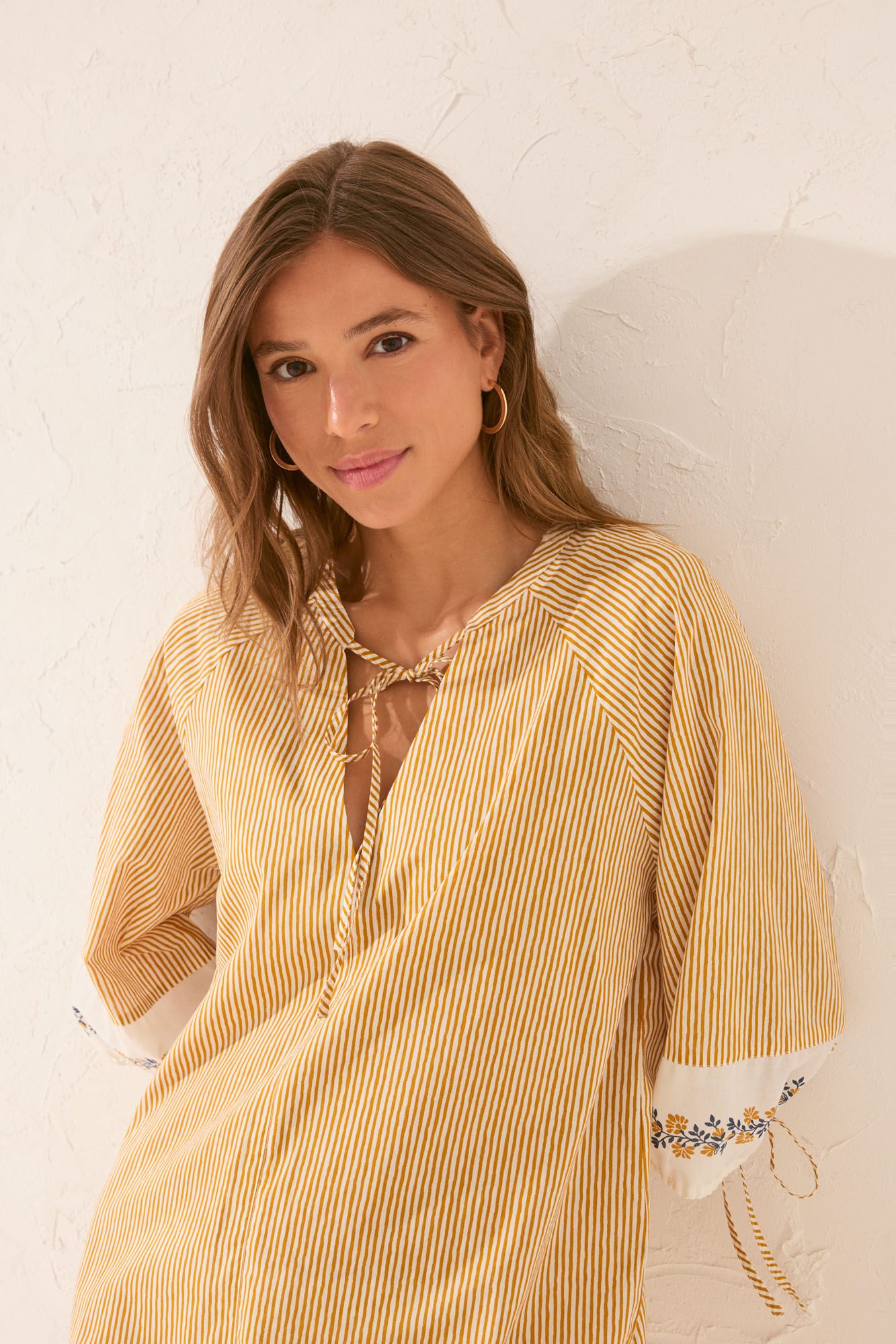 تونيك متوسط الطول من القطن ١٠٠٪، بأكمام ثلاثة أرباع من قماش الفوال القطني، بطبعة مخططة بالكامل. مثالي للارتداء في المنزل، أو لإطلالاتكِ على الشاطئ أو حمام السباحة. رقبة دائرية بقصة من المنتصف وشريط للربطة، والفيونكة، والدانتيل. أكمام راجلان منفوخة برباط عند الخصر.