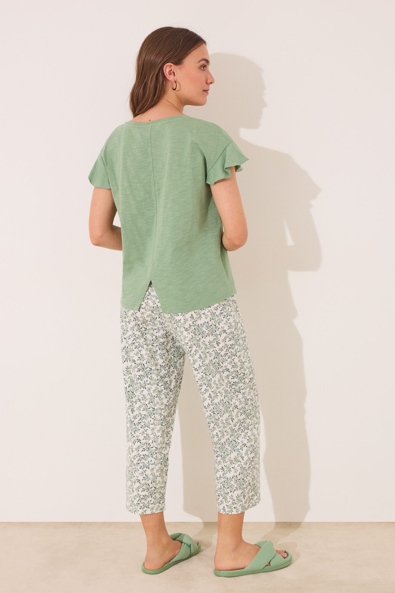 طقم بيجاما بأكمام قصيرة مع بنطلون كابري. توب سادة بأكمام قصيرة من قماش الجيرسيه سلاب بياقة دائرية مفتوحة، وأكتاف منسدلة، وأكمام واسعة، وتطريز حروف على الصدر. بنطلون بطبعة زهور شاملة مع حزام خصر مطاطي قابل للتعديل
