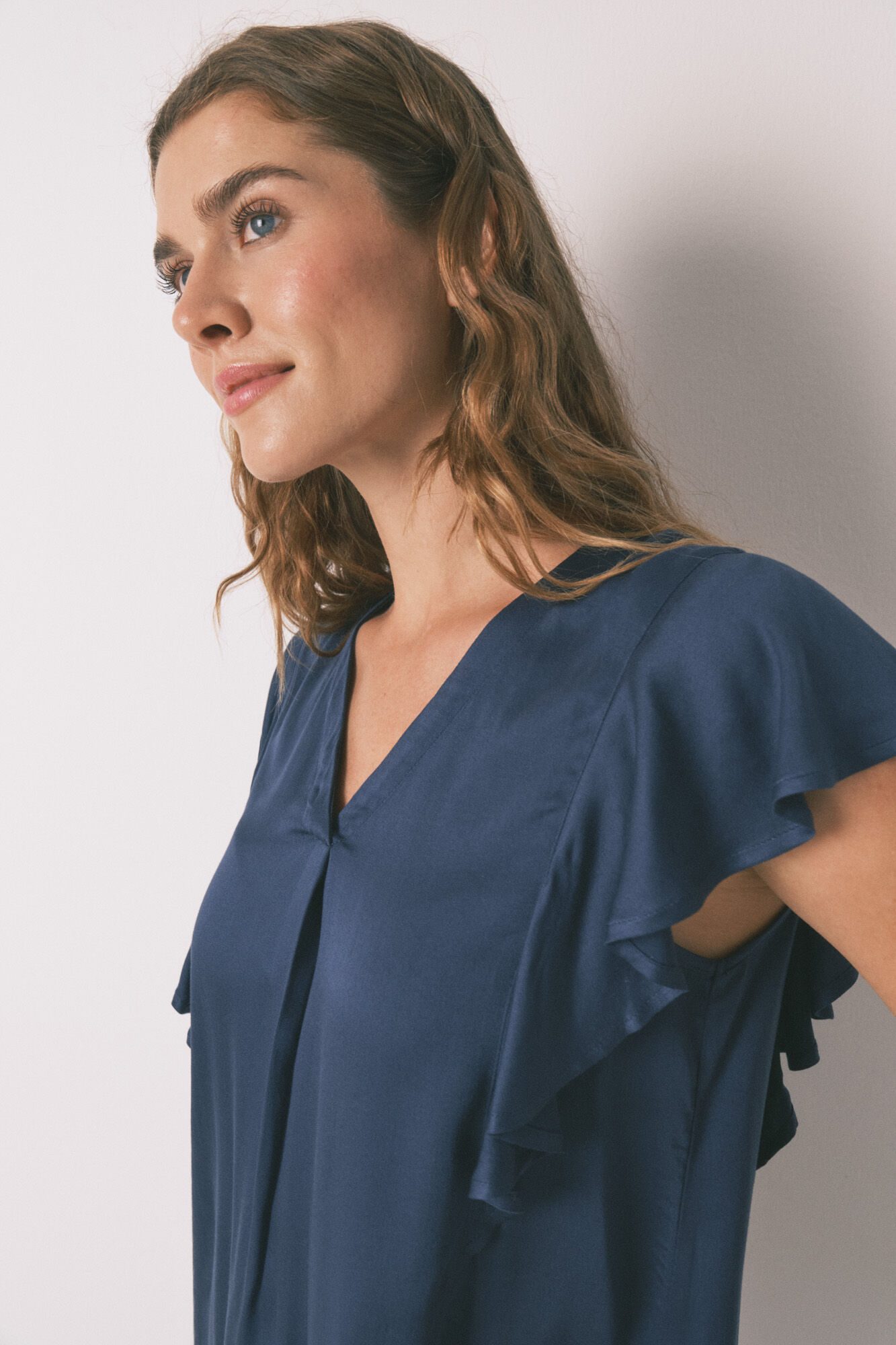 بيجاما بأكمام قصيرة مع بنطلون كابري من ساتان الفيسكوز. توب سادة فضفاض بياقة على شكل V وحافة واسعة. أكمام مكشكشة، وحافة أطول قليلاً، وفتحات جانبية. بنطلون بطبعة زهور شاملة وحزام خصر مطاطي مع رباط سحب متباين