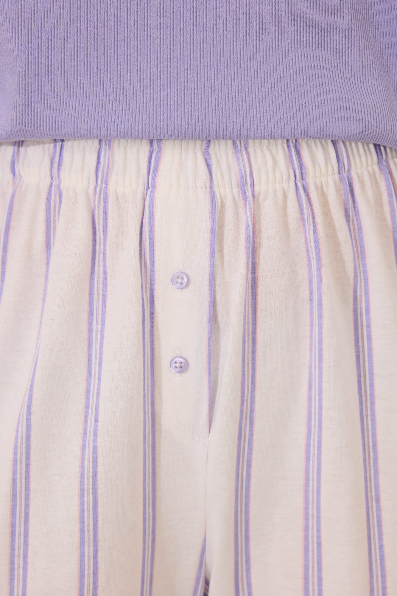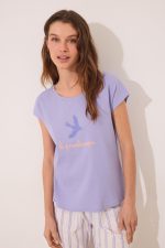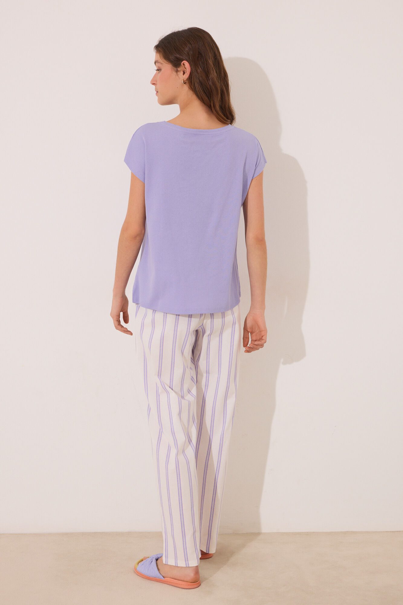 -70%Pyjamas made of cotton fabric , with a plain ribbed T-shirt and long trouser with a striped print in lilac tones. Ideal for staying at home in super comfort and style. short-sleeved T-shirt with a round neck, dropped shoulders and embroidered detail