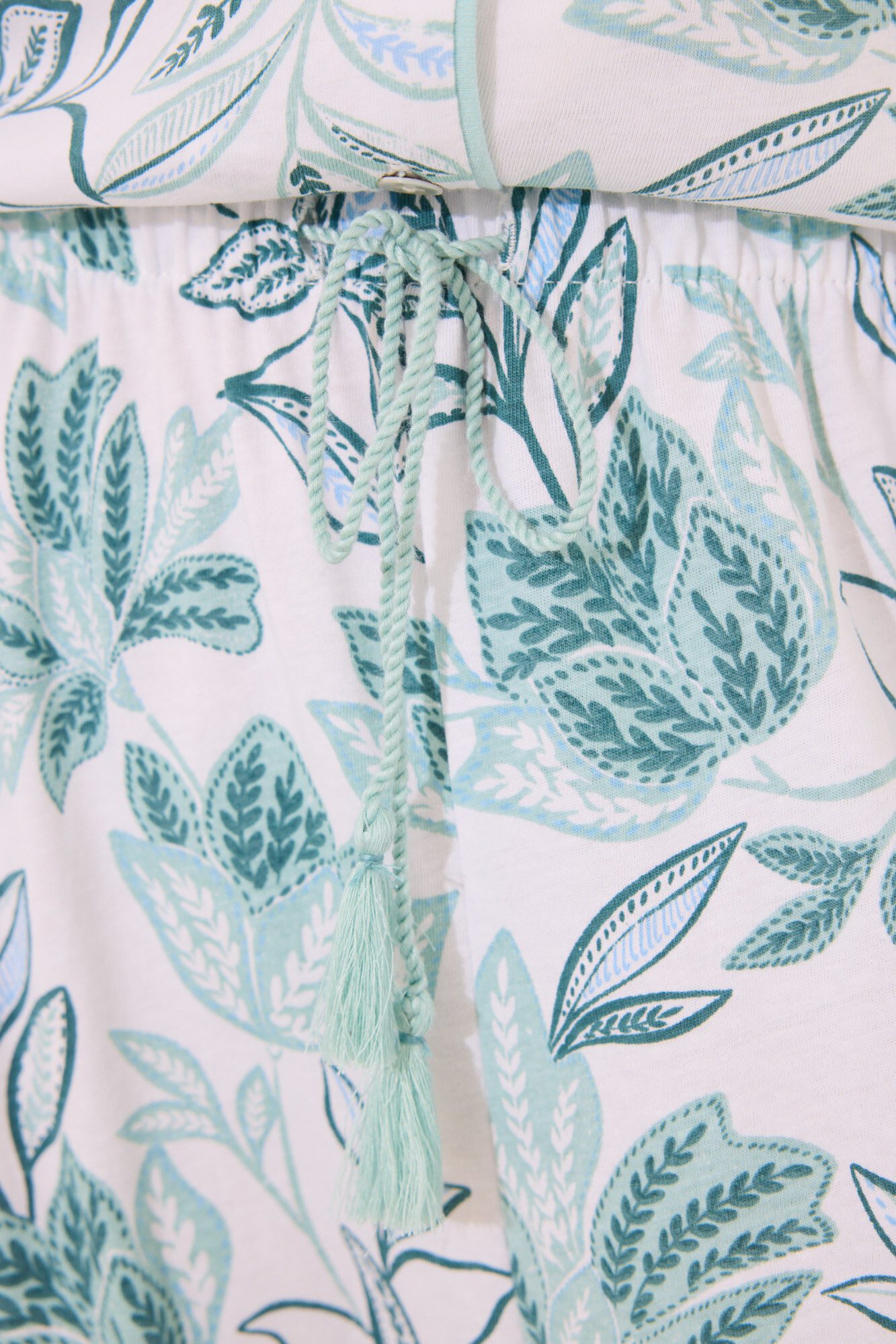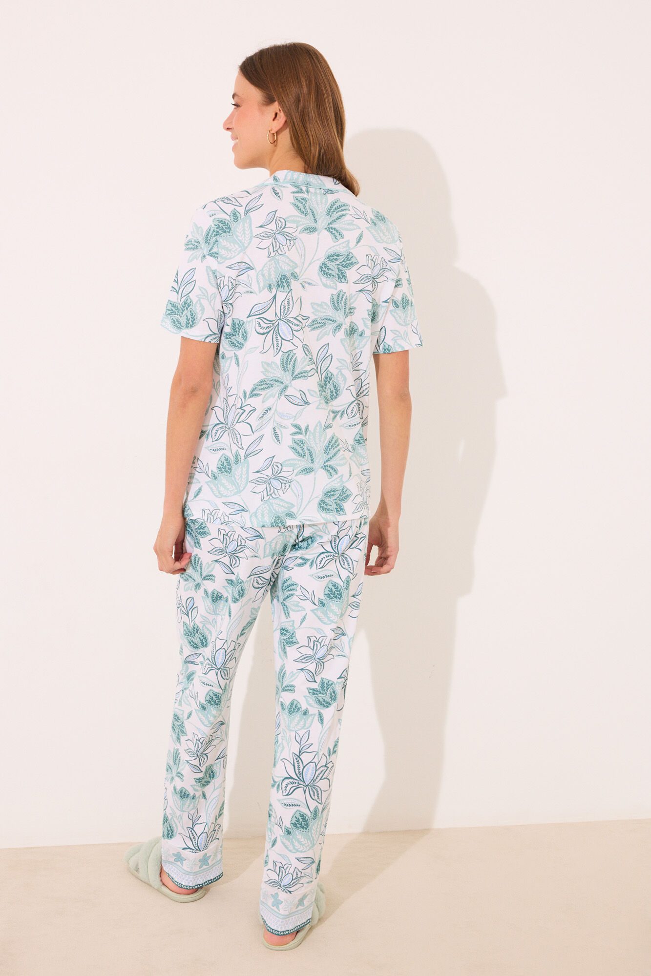 -70%short sleeve classic pyjamas with long trouser , made from 100% cotton fabric , with a floral print in green tones. Ideal for staying at home in super comfort and style. Top with a shirt collar, central buttoning, a patch pocket on the bust, chest o