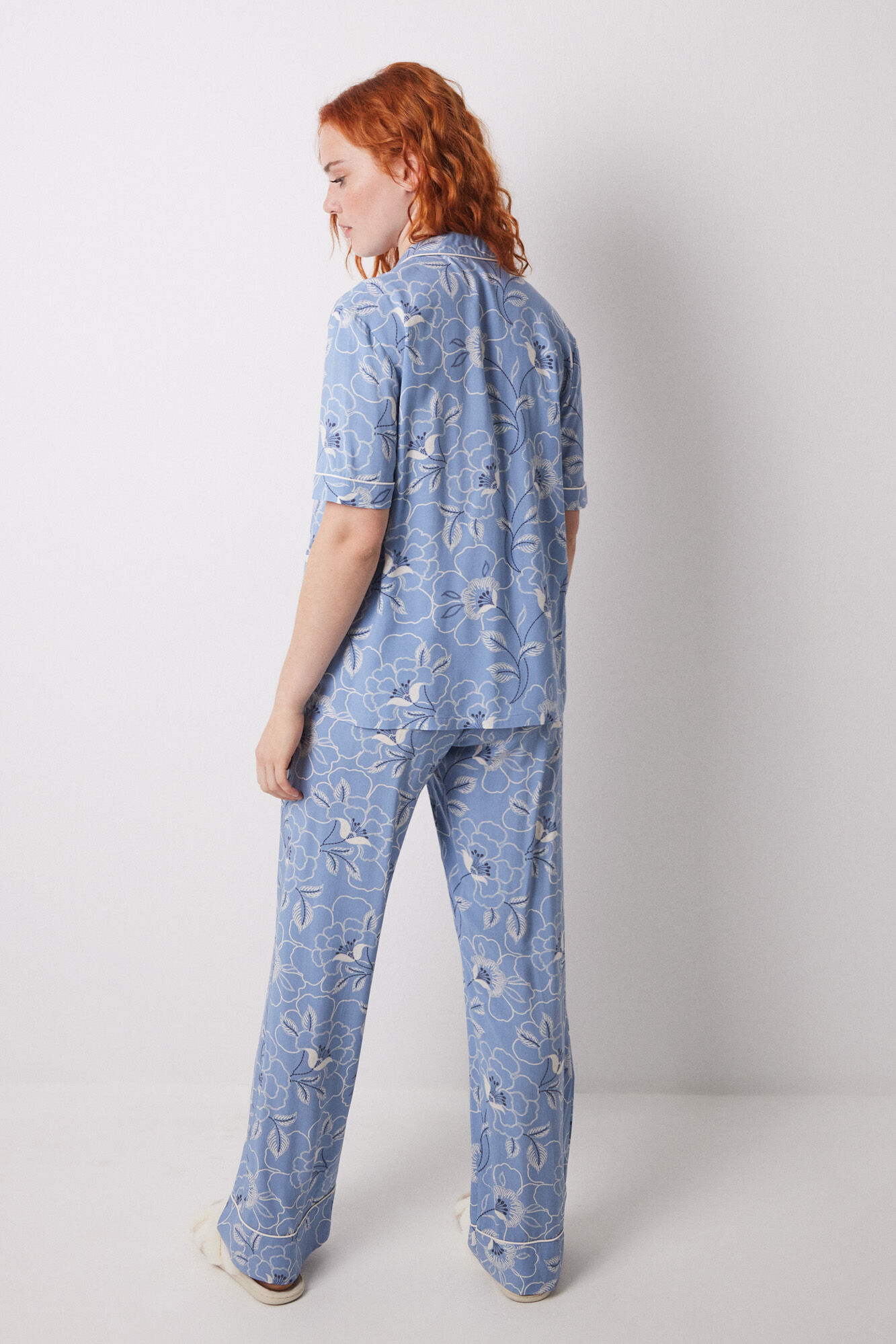 -70%Classic pyjamas, made of blue viscose fabric , with a floral print . Ideal for staying at home super warm and stylish.