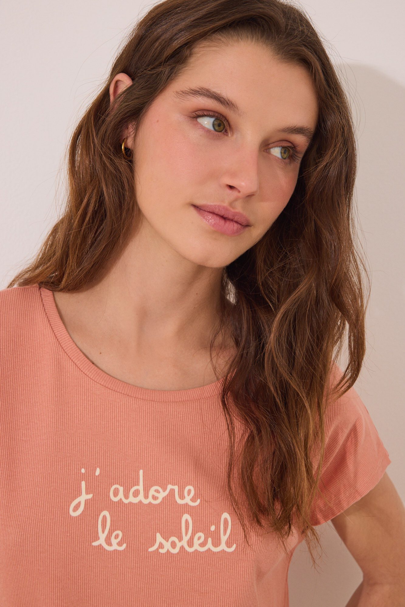 -70%Short pyjamas made of cotton fabric , with a plain ribbed T-shirt and short with a leaf print in orange tones. Ideal for staying at home in super comfort and style. short-sleeved T-shirt, with a round neck, dropped shoulders and embroidered detail o