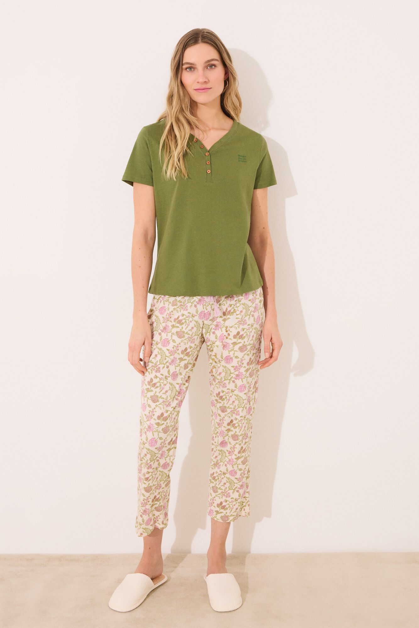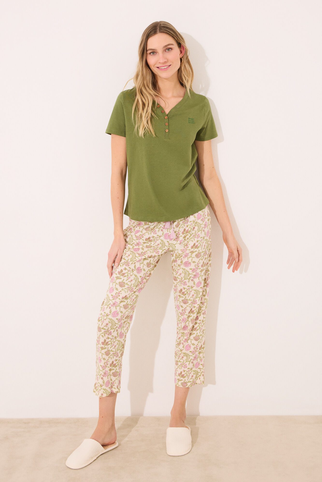 -70%Plain short sleeve T-shirt , fabric of 100% cotton, in green with embroidered detail on the bust, chest or breast. Wear it with the trouser from the collection you like the most and create your own combination. This way you multiply options! With a