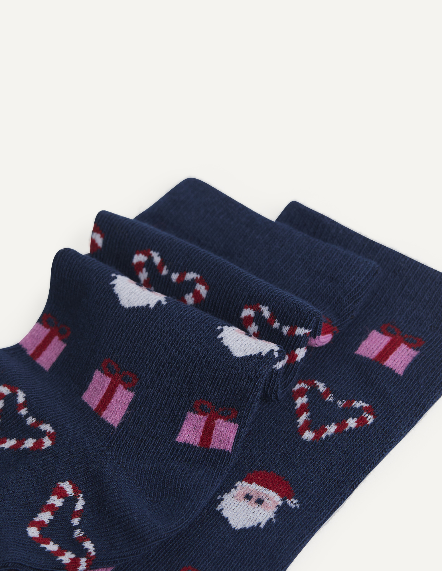 Short socks in soft knit. Cute and colorful Christmas pattern on a midnight blue base. Light, breathable, and fresh on the skin.