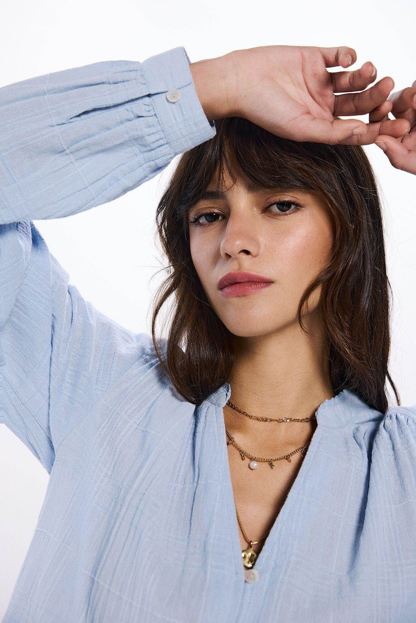 -70%long sleeve blouse with volume, with a mandarin collar with a V- neckline , with buttons on the front and cuffs, with lace detail on the neckline and with structure.