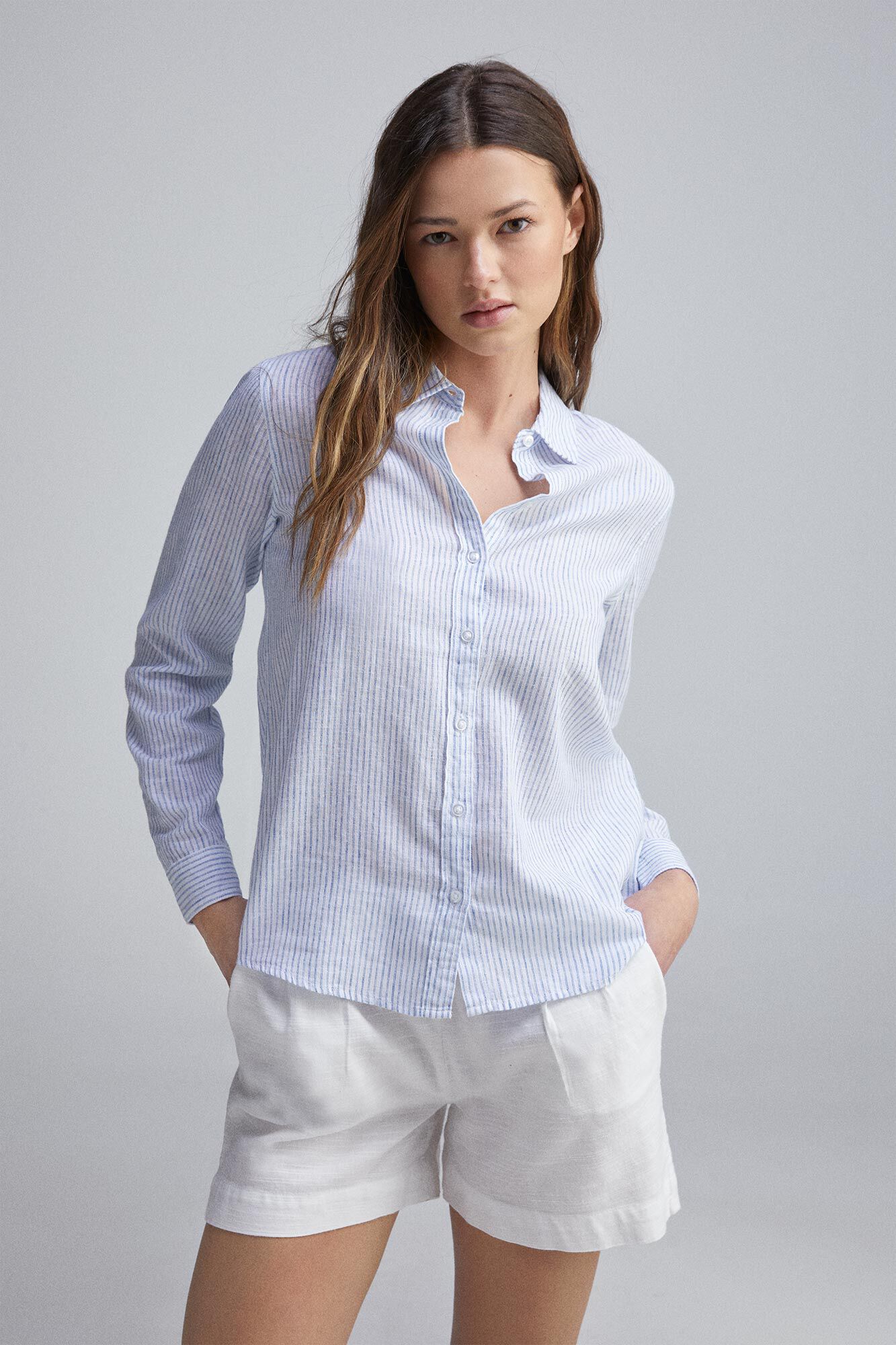 -69%Straight long sleeve shirt with a shirt collar and buttons on the front and cuffs. In a linen and cotton blend.