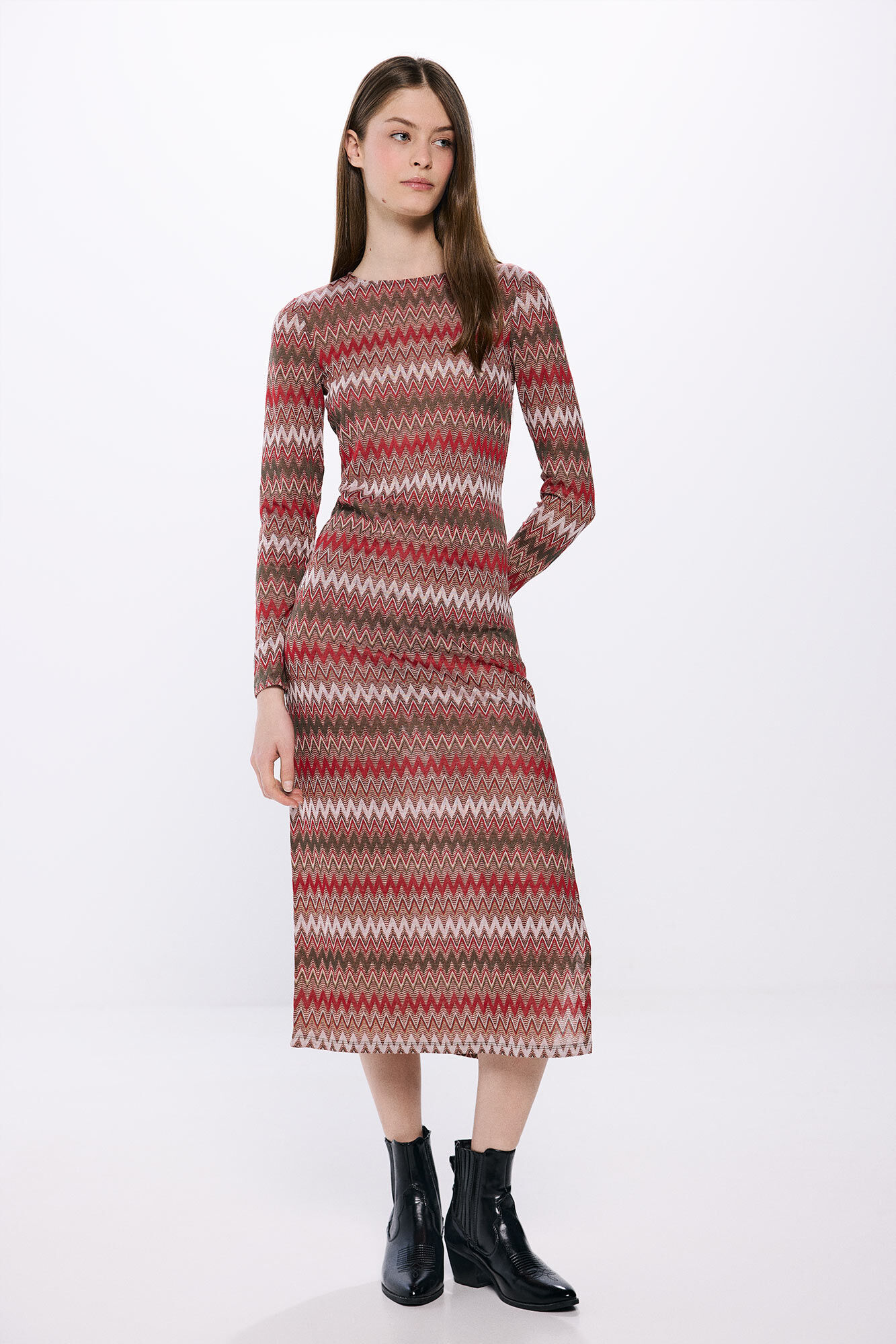 -70%long sleeve tube midi dress with a round neck and zigzag borders in maroon, green and ecru tones.