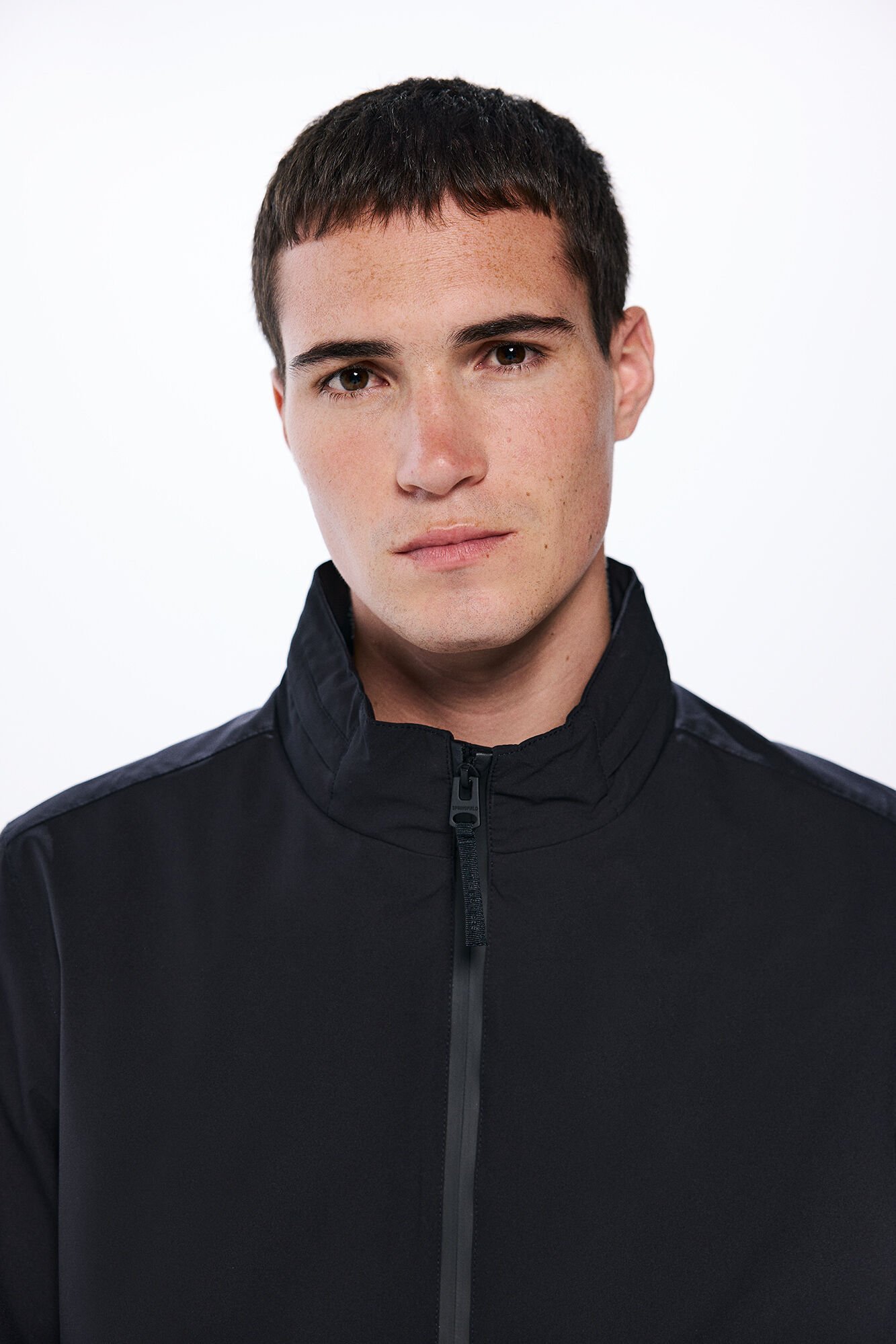 Technical jacket in water-repellent, PFC-free, windproof and breathable comfort stretch polyester. Lined in breathable moisture control fabric. Zip fastening and zipped pockets, high neck with stowaway hood, stretch jersey-knit cuffs and hem, inside pocke