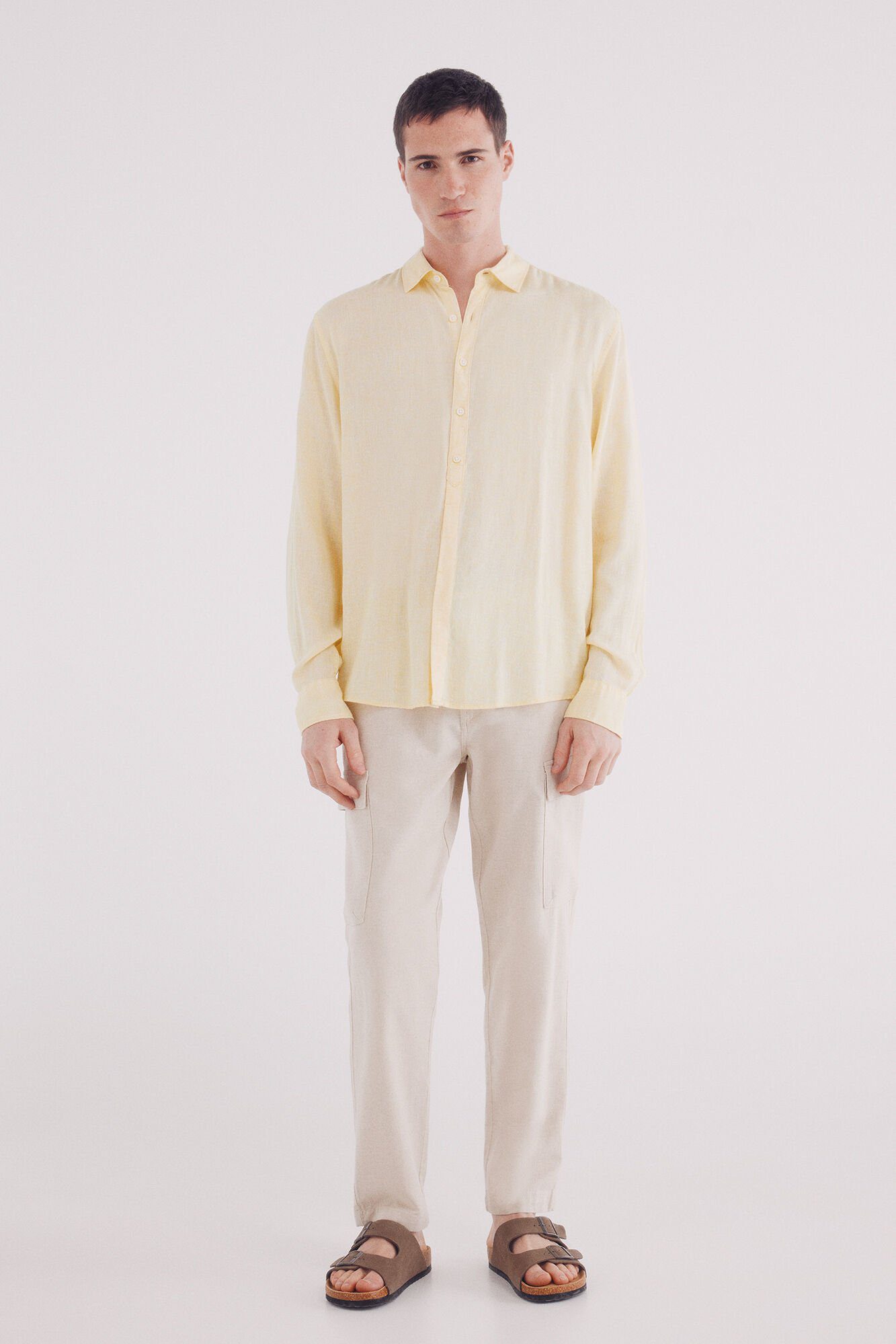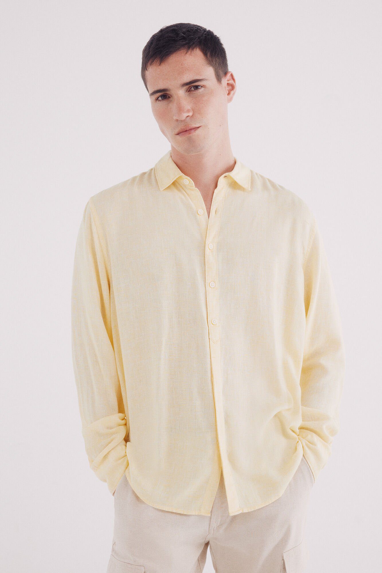 -60%regular fit long sleeve polo shirt shirt in linen viscose thread-by-thread fabric. Matching button.