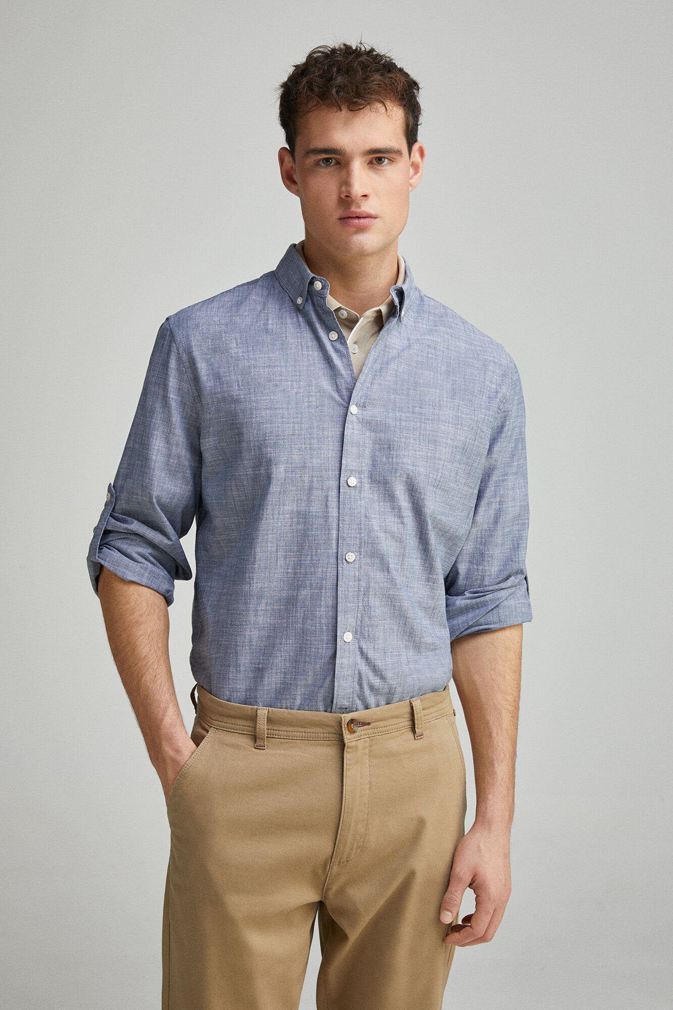-70%regular fit long sleeve shirt, buttoned at the neck in 100% plain plain cotton slub fabric. Tone-on-tone embroidered Springfield logo and pearlescent button.