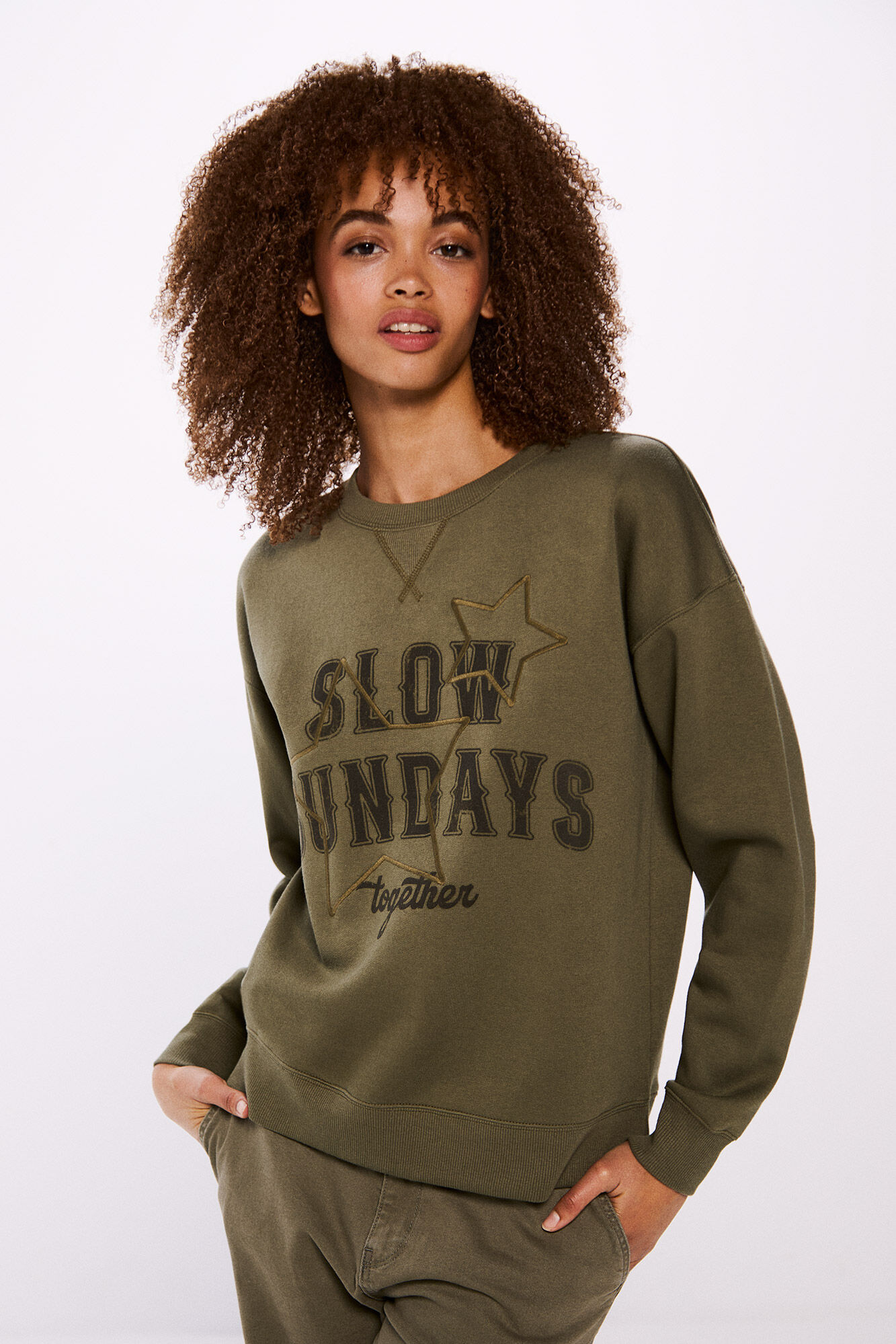 Sweatshirt with long sleeve , with a round neck, with a positional text graphic print on the front, with ribbing on the neck , cuffs and hem.