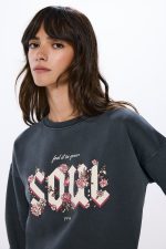 Sweatshirt with long sleeve , with a round neck, with a positional graphic print of drawing and text on the front, with ribbing on the neck , cuffs and hem.