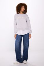 long sleeve sweatshirt with a round neck, embossed text on the front, a combination of fabric on the hem, and ribbing on the neck, cuffs and hem.