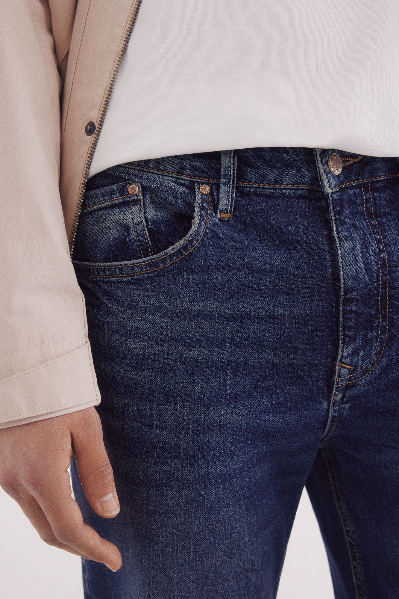 -70%Slim fit 5-pocket stretch jeans. False selvedge details. Medium-dark wash, slightly soiled, vintage used look. Zip fly.