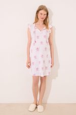 -70%Short maternity nightgown made of cotton and modal, in ivory with a large floral stamp print . Wear it with its matching robe for the perfect set. Adjustable round neck with tie, bow, lace, suitable for breastfeeding. Short sleeves with ruffle