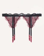 Garter belt made of elegant embroidered and recycled tulle and fine lace. Easily adjustable waist for an excellent fit. Refined black base with sensual burgundy embroidery.