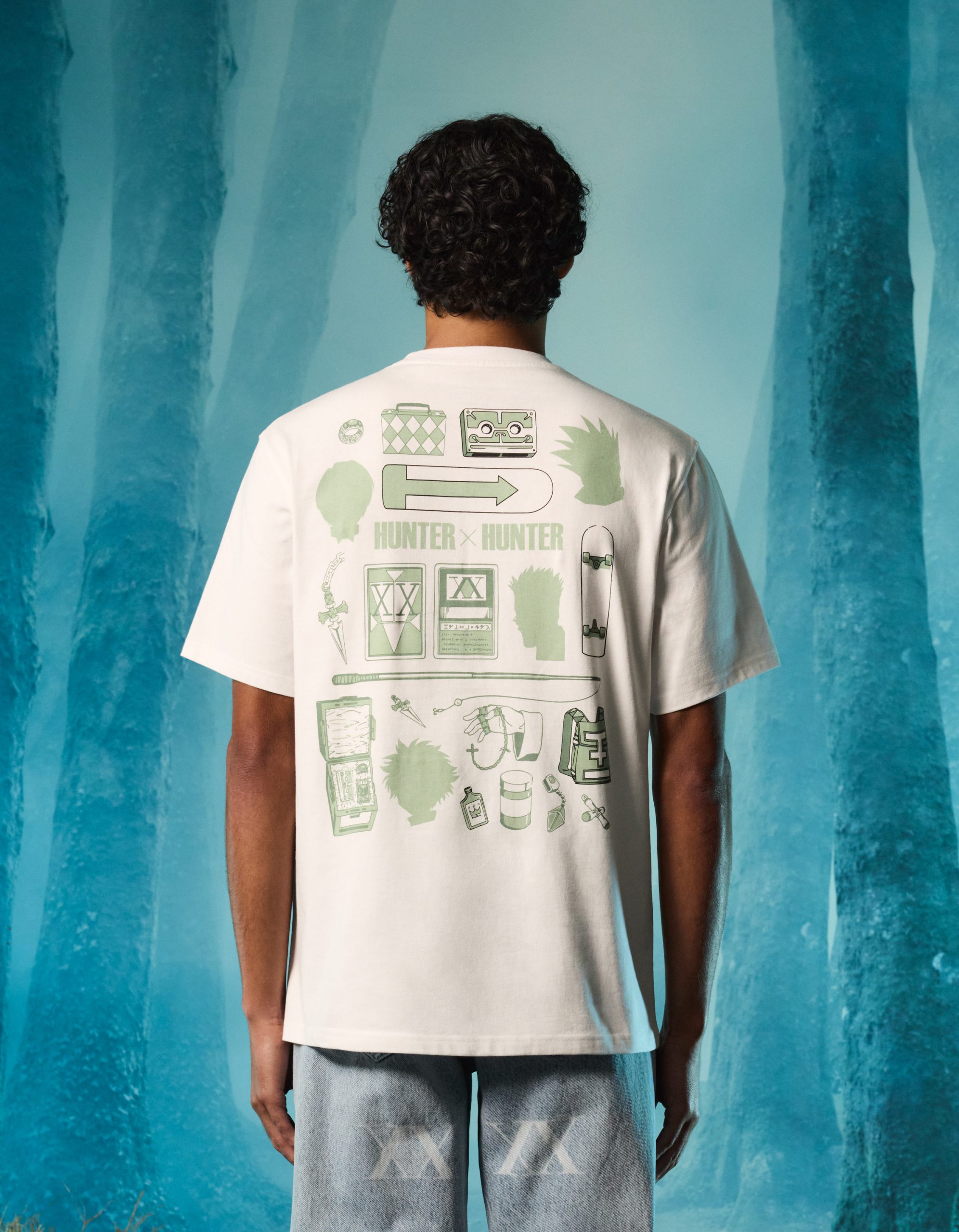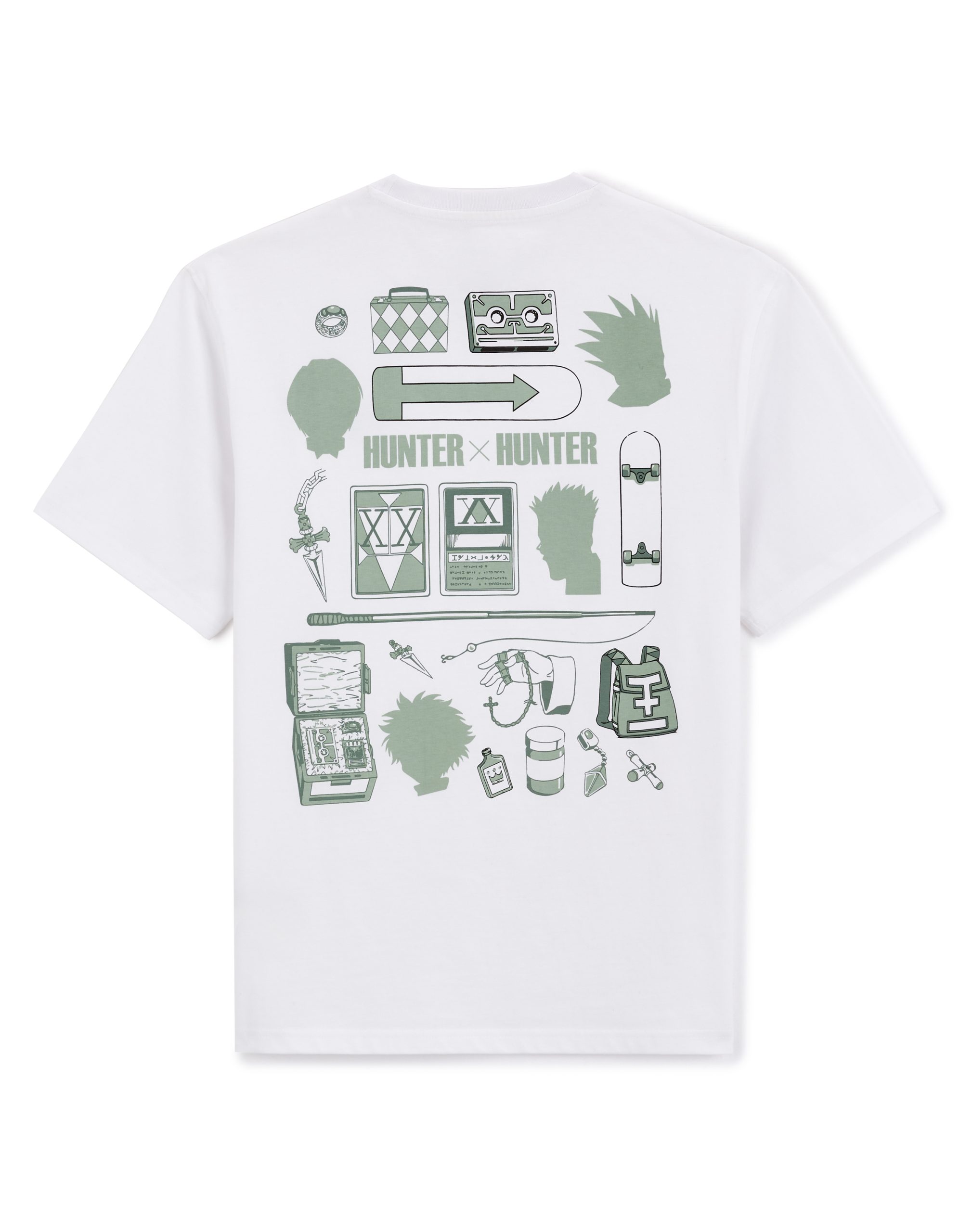 -71%For men who love the captivating world of Hunter x Hunter, this t-shirt is a must-have. White Hunter x Hunter t-shirt Short sleeves Round neck Boxy cut Print which brings together on the back, the accessories of 4 main characters: Gon, Leorio, K