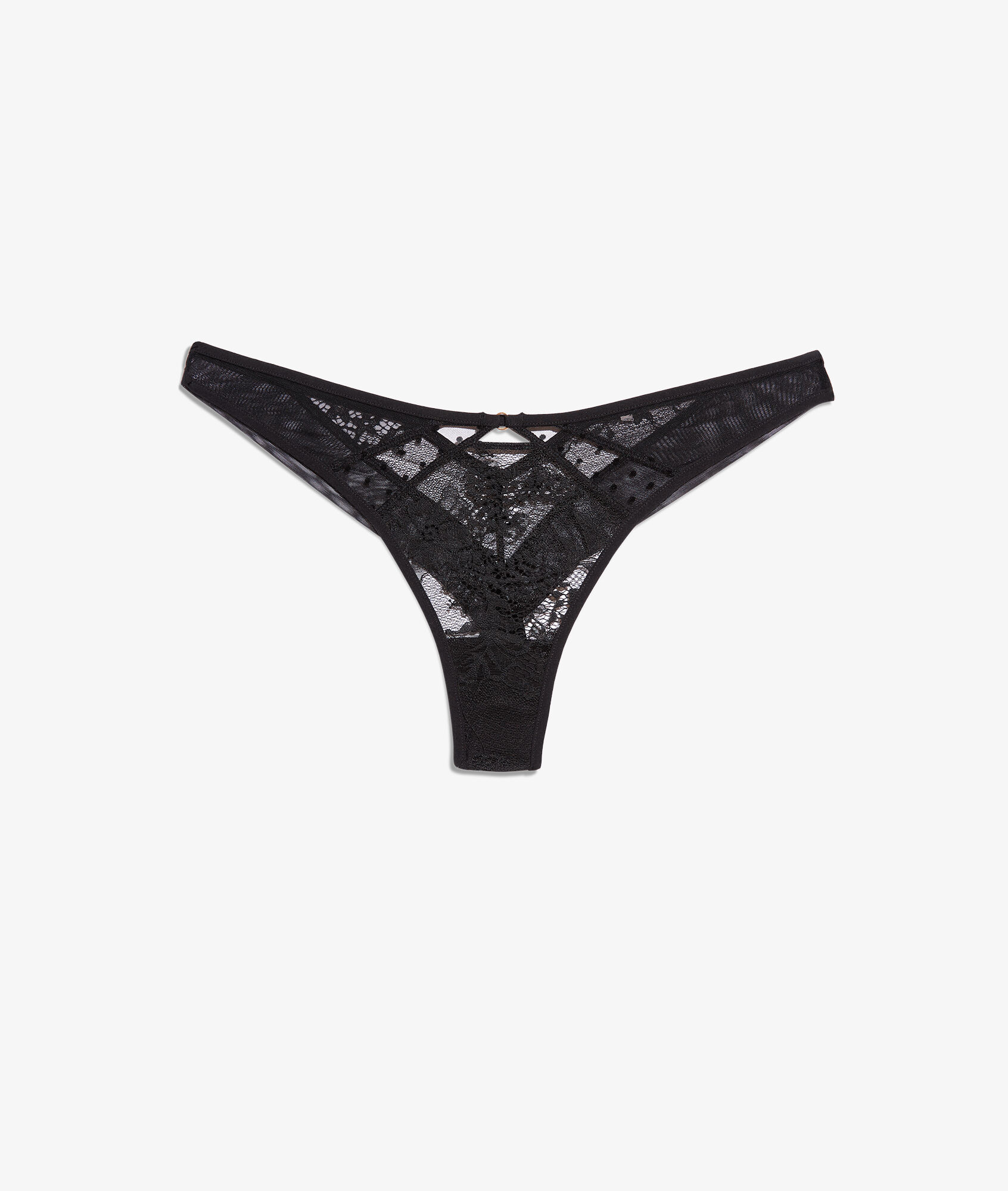 French savoir-faire since 1916. Embroidered lace and dotted tulle exude sensuality on this tanga featuring lovely plays of transparency, delicately openwork at the front and back.