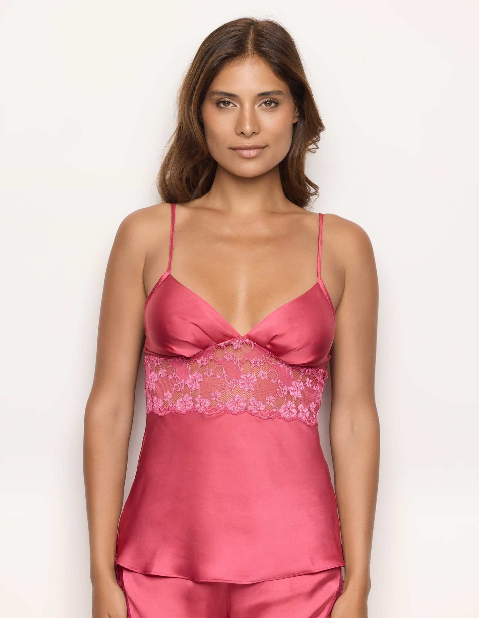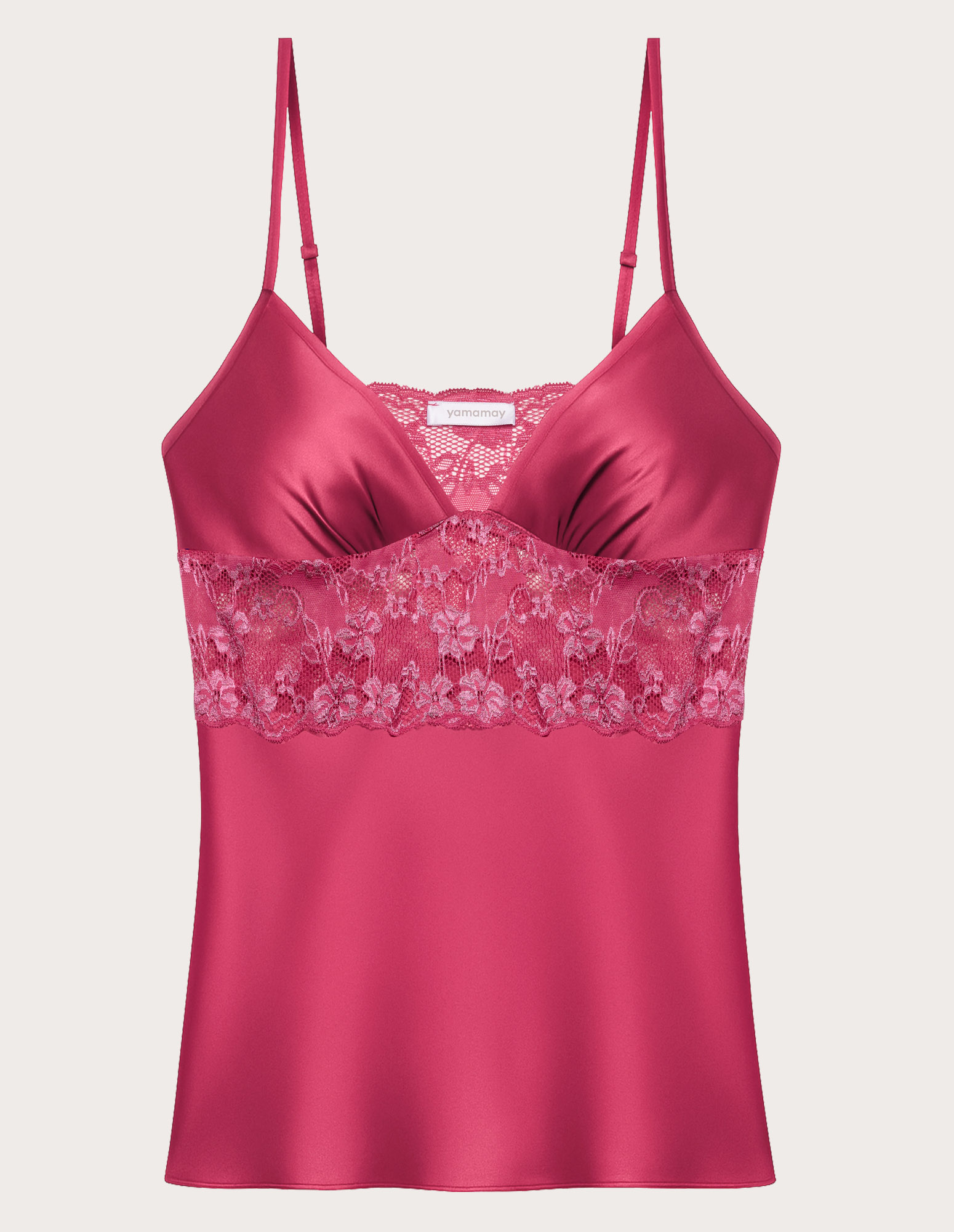 -29%The mauve pink satin top has embroidered lace trim below the bust and on the back. Thin adjustable straps and unlined cups complete the design. Ideal as elegant lingerie or a very light pajama top, paired with coordinating culottes, or worn under jackets