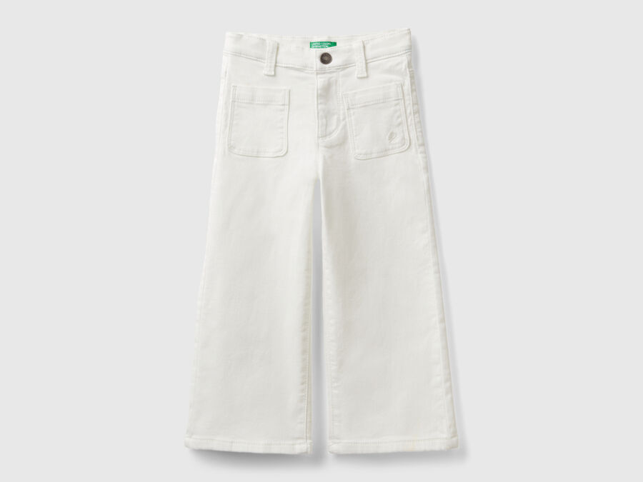 -40%Long trousers in stretch soft cotton. Wide leg with front patch pockets. Practical zip and button opening, logo embroidered on one pocket. For a modern and decisive look.