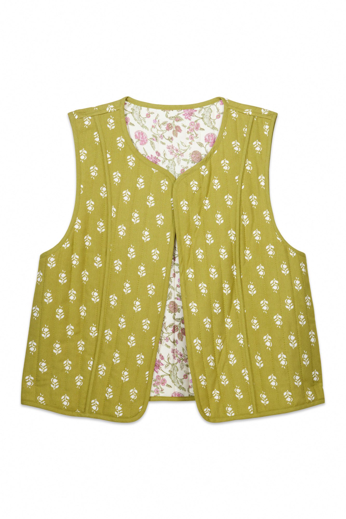 -70%Short, reversible , quilted gilet in 100% cotton fabric with a pretty stamp print in green tones. Get two garments in one and join the trend of the moment! With a round neck and piping details on the neck, armholes and bust, chest or breast. C