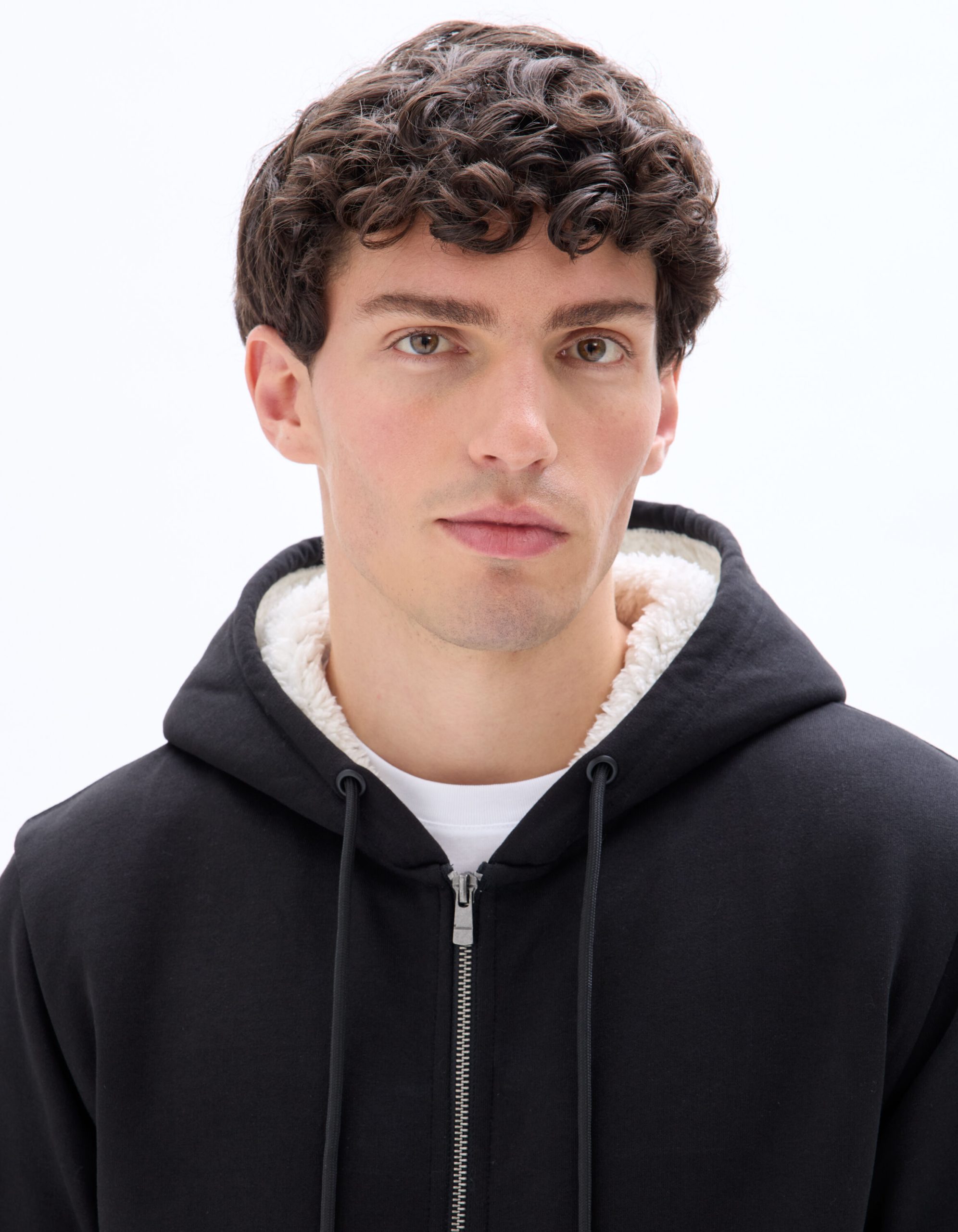 Discover ultimate comfort with our men’s zip-up hoodie, ideal for those chilly autumn days. Black sweatshirt Sherpa-lined interior Long sleeves Hooded Pair it with jeans or chinos for a complete casual look Available in several colours Wash at 30°C,